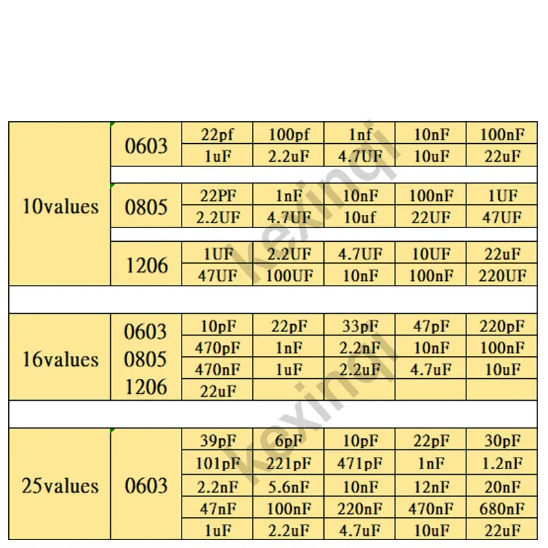 10 valores 22pf 100pf 1NF 10nF 100nF 1uF 2,2 uF 4,7 UF 10uF 22uF 22PF 1nF 10nF 100nF 1UF 2,2 UF 4,7 UF 10UF 22UF 47UF 1206 1UF 2,2 UF 4,7 UF 10UF 22uF 47UF 100UF 10nF 100nF 220UF 16 valores 1206 10pF 22pF 33pF 47pF 220pF 470pF 1nF 2,2nF 10nF 100nF 470nF 1uF 2,2 uF 4,7 uF 10uF 22uF 25 valores 39pF 6pF 10pF 22pF 30pF 101pF 221pF 471pF 1nF 1.2nF 2,2nF 5.6nF 10nF 12nF 20nF 47nF 100nF 220nF 470nF 680nF 1uF 2,2 uF 4,7 uF 10uF 22uF 30 valores 1pF 1.2pF 1,5 pF 2.2pF 3,9 pF 4,7 pF 8.2pF 10pF 12pF 15pF 18pF 22pF 27pF 30pF 33pF 47pF 101pF 151pF 221pF 391pF 1nF 4.7nF 10nF 22nF 33nF 100nF 1uF 2,2 uF 4,7 uF 10uF 31 valores 1pF 2,2 PF 3.3pf 4,7 pF 6.8pf 10pF 22pF 33pF 47pF 68pF 100pF 220pF 330pF 470pF 680pF 1nF 2,2nF 3.3nF 4.7nF 6,8 nF 10nF 22nF 33nF 47nF 68nF 100nF 220nF 330nF 470nF 680nF 1uF 36 valores 1206 1pF 4,7 pF 6,8 pF 10pF 15pF 18pF 20pF 22pF 30pF 33pF 47pF 68pF 100pF 150pF 180pF 220pF 330pF 470pF 680pF 1nF 2,2nF 3.3nF 4.7nF 10nF 22nF 33nF 47nF 68nF 100nF 220nF 330nF 470nF 1uF 2,2 uF 4,7 uF 10uF 50 valores 0805 1pF 1,5 pF 3pF 4,7 pF 5pF 5,6 pF 6,8 pF 8.2pF 10pF 12pF 18pF 20pF 22pF 27pF 30pF 33pF 47pF 56pF 68pF 75pF 82pF 100pF 120pF 150pF 180pF 200pF 220pF 330pF 390pF 470pF 680pF 560pF 1nF 1,5 nF 2,2nF 3.3nF 4.7nF 6,8 nF 10nF 22nF 33nF 47nF 68nF 100nF 150nF 220nF 330nF 470nF 1uF 10UF 1pF 10pF 12pF 15pF 18pF 20pF 22pF 30pF 33pF 47pF 51PF 56pF 68pF 82pF 100pF 120pF 150pF 200pF 220pF 330pF 470pF 680pF 820pF 1nF 1,5 nF 2,2nF 3.3nF 4.7nF 5.6NF 6,8 nF 10nF 22nF 33nF 47nF 68nF 82nF 100nF 220nF 330NF 470nF 680nF 820nF 1uF 2,2 UF 3,3 UF 4,7 UF 10UF 22UF 47UF 100UF