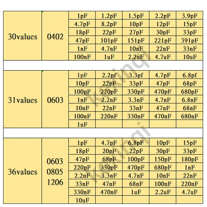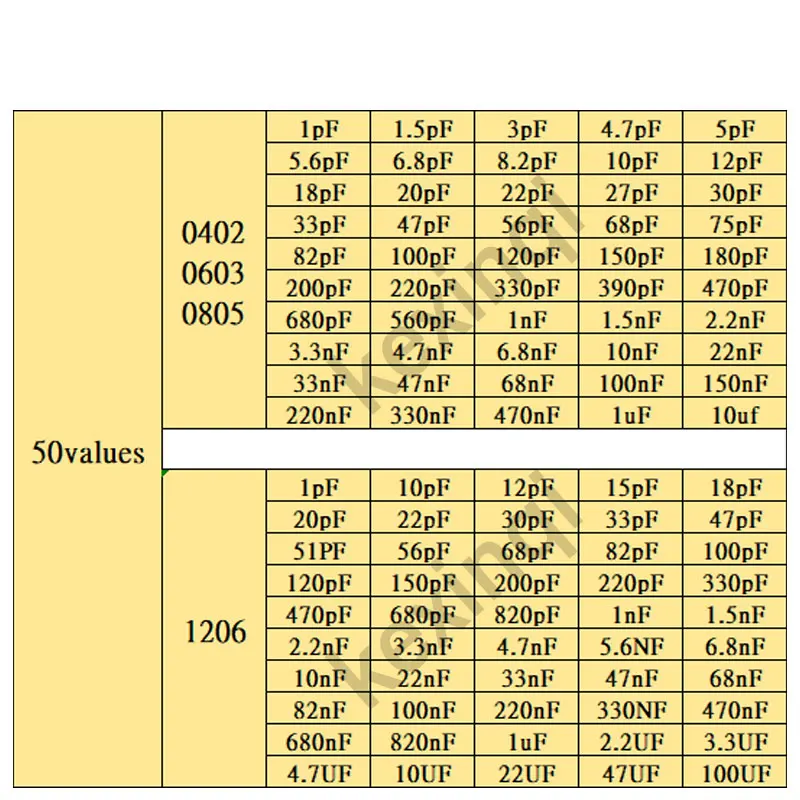 10 valores 22pf 100pf 1NF 10nF 100nF 1uF 2,2 uF 4,7 UF 10uF 22uF 22PF 1nF 10nF 100nF 1UF 2,2 UF 4,7 UF 10UF 22UF 47UF 1206 1UF 2,2 UF 4,7 UF 10UF 22uF 47UF 100UF 10nF 100nF 220UF 16 valores 1206 10pF 22pF 33pF 47pF 220pF 470pF 1nF 2,2nF 10nF 100nF 470nF 1uF 2,2 uF 4,7 uF 10uF 22uF 25 valores 39pF 6pF 10pF 22pF 30pF 101pF 221pF 471pF 1nF 1.2nF 2,2nF 5.6nF 10nF 12nF 20nF 47nF 100nF 220nF 470nF 680nF 1uF 2,2 uF 4,7 uF 10uF 22uF 30 valores 1pF 1.2pF 1,5 pF 2.2pF 3,9 pF 4,7 pF 8.2pF 10pF 12pF 15pF 18pF 22pF 27pF 30pF 33pF 47pF 101pF 151pF 221pF 391pF 1nF 4.7nF 10nF 22nF 33nF 100nF 1uF 2,2 uF 4,7 uF 10uF 31 valores 1pF 2,2 PF 3.3pf 4,7 pF 6.8pf 10pF 22pF 33pF 47pF 68pF 100pF 220pF 330pF 470pF 680pF 1nF 2,2nF 3.3nF 4.7nF 6,8 nF 10nF 22nF 33nF 47nF 68nF 100nF 220nF 330nF 470nF 680nF 1uF 36 valores 1206 1pF 4,7 pF 6,8 pF 10pF 15pF 18pF 20pF 22pF 30pF 33pF 47pF 68pF 100pF 150pF 180pF 220pF 330pF 470pF 680pF 1nF 2,2nF 3.3nF 4.7nF 10nF 22nF 33nF 47nF 68nF 100nF 220nF 330nF 470nF 1uF 2,2 uF 4,7 uF 10uF 50 valores 0805 1pF 1,5 pF 3pF 4,7 pF 5pF 5,6 pF 6,8 pF 8.2pF 10pF 12pF 18pF 20pF 22pF 27pF 30pF 33pF 47pF 56pF 68pF 75pF 82pF 100pF 120pF 150pF 180pF 200pF 220pF 330pF 390pF 470pF 680pF 560pF 1nF 1,5 nF 2,2nF 3.3nF 4.7nF 6,8 nF 10nF 22nF 33nF 47nF 68nF 100nF 150nF 220nF 330nF 470nF 1uF 10UF 1pF 10pF 12pF 15pF 18pF 20pF 22pF 30pF 33pF 47pF 51PF 56pF 68pF 82pF 100pF 120pF 150pF 200pF 220pF 330pF 470pF 680pF 820pF 1nF 1,5 nF 2,2nF 3.3nF 4.7nF 5.6NF 6,8 nF 10nF 22nF 33nF 47nF 68nF 82nF 100nF 220nF 330NF 470nF 680nF 820nF 1uF 2,2 UF 3,3 UF 4,7 UF 10UF 22UF 47UF 100UF