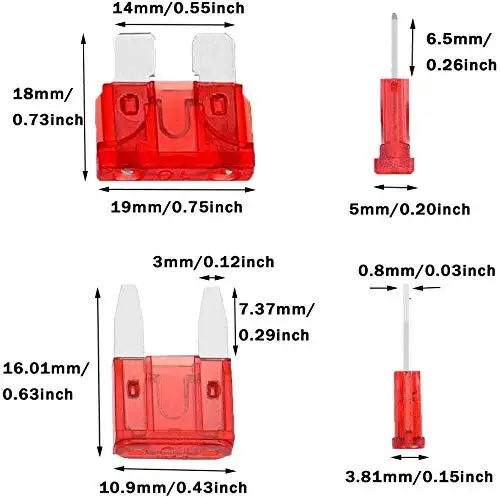 • [LISTA DE TAMAÑOS] Este juego incluye 300 de fusibles de cuchilla de uso común y un extractor de fusibles. Fusibles de tamaño estándar que incluyen 2A, 12, 3A, 12, 12, 5A, 12, 12, 12, 12, 12, 12, 12, 12, 12, 3A, 12, 12, 5A, 12, 12, 12, 10A, 24, 15A, 24A, 20A, 12, 25A, 12, 12A, 30A, 12, 30A, 25, 12, 25, 25, 2, 2, 2, 12, 12, 35A 12, 40A 12, 40A 12, 1, 2, 2, 1, 2, 1, 2, 1, 2, 1, 2, 1, 2, 1, 2, 1, 2, 2, 1, 2, 2, 2, 1, 2, 5, 2, 5, 2, 5, 5, 2, 5, 5, 5, 5, 5, 2, 5, 5, 5, 5, 5, 5, 5, Fusibles de tamaño mini que incluyen 2A 12, 3A 12, 3A 12, 5A 12, 5A 12, 7.5A 12, 10A 12, 10A 18, 15A 18, 15A 18, 3A 12, 3A 12, 3A 12, 5A 12, 12, 12, 25, 12, 12, 12, 25, 12, 12, 10, 10, 10, 10, 10, 12, 4, 4, 4, 4, 4, 4, 4, 4, 4, 35A 12, 40A 12, 40A 12, 35A 12, 25, 25, 30, 25, 25, 25, 30, 30, 25, 30, 25, 30, 30, 30, 30