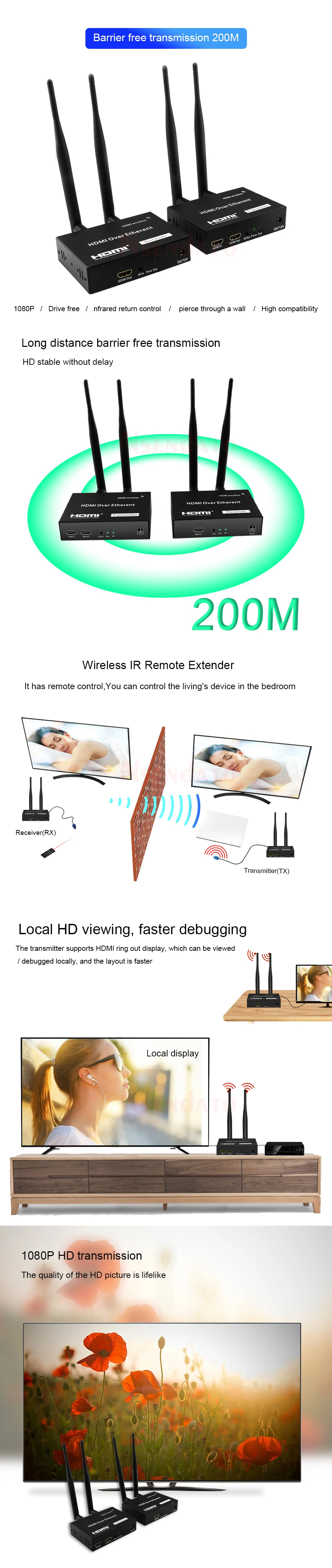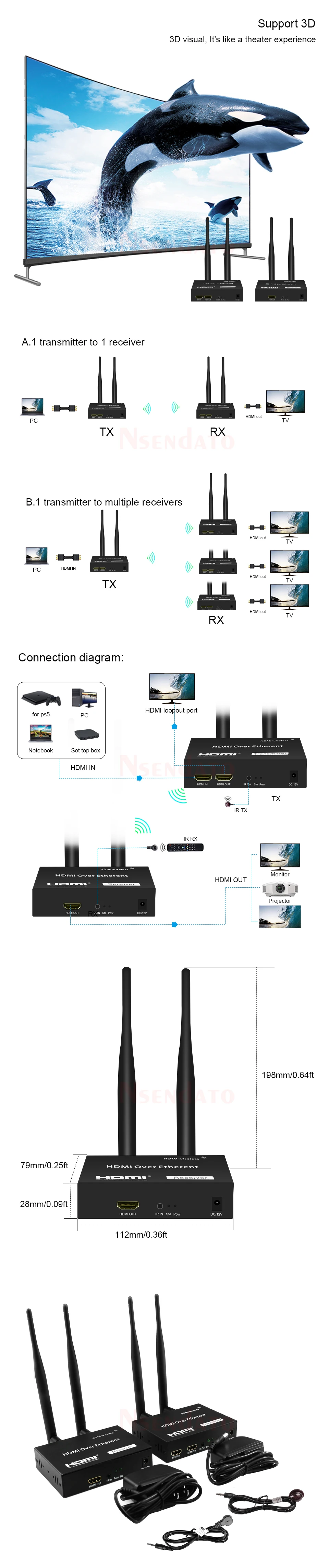 1.El producto consta de un transmisor Nsendato y un receptor, que transmite señales HDMI a través de WIFI inalámbrico y admite hasta 1 transmisor a 4 receptores, 200 metros sin obstrucciones; 164 pies (50 metros) a través de la pared.
