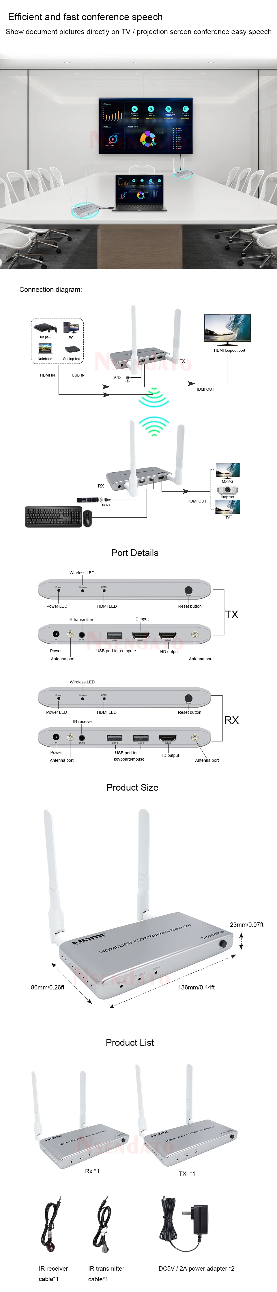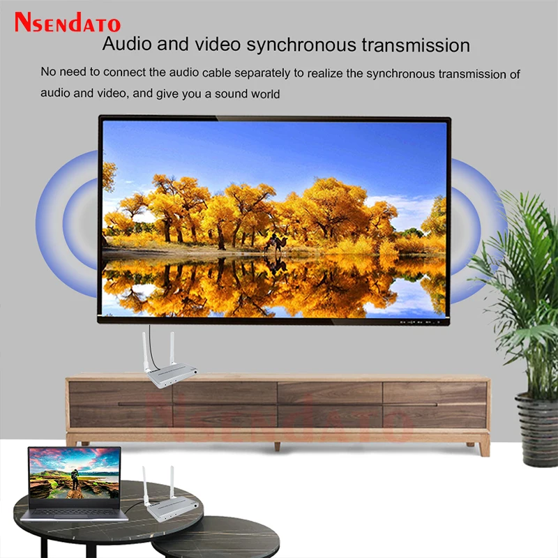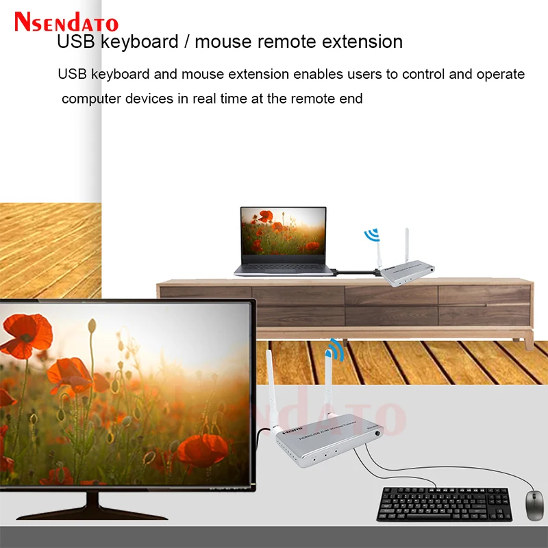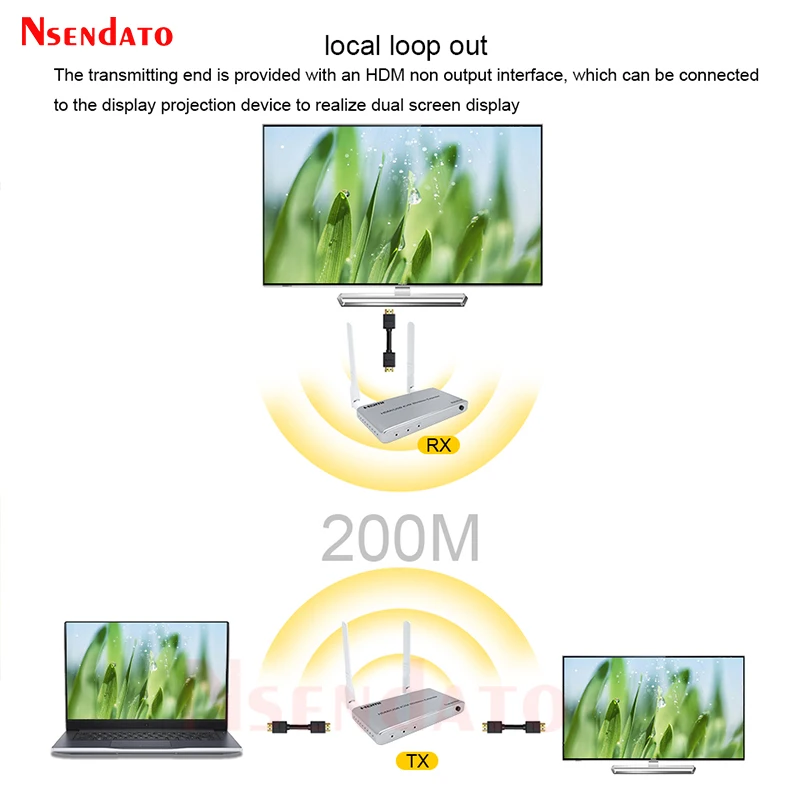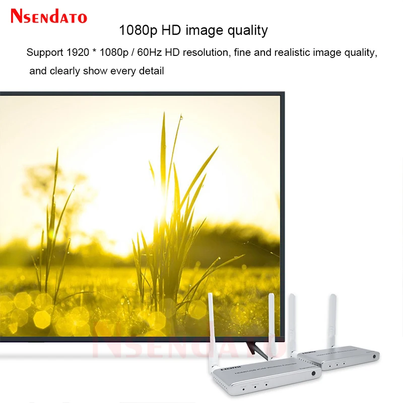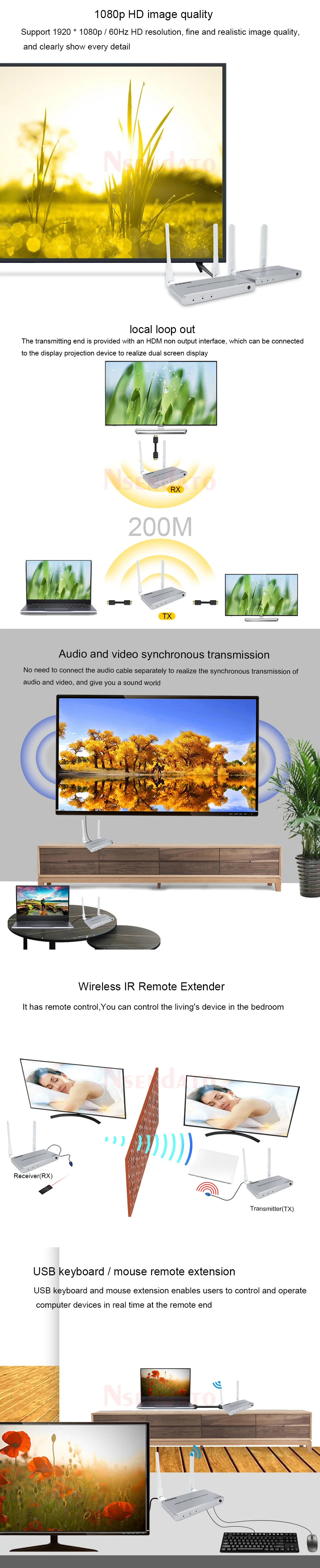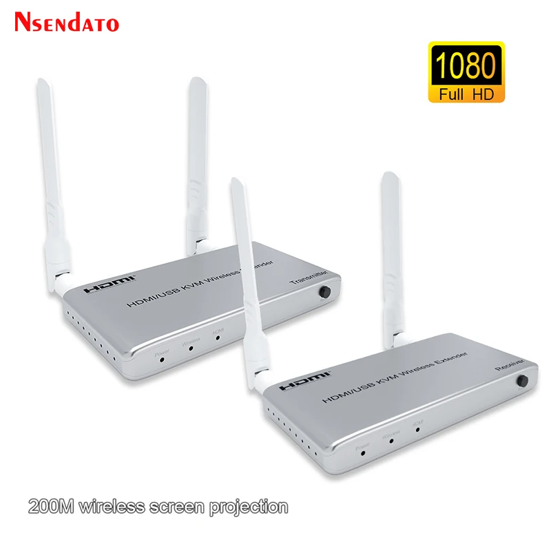 5G inalámbrico HDMI Audio Video transmisor y receptor kit 1080P 60Hz 200M HDMI KVM Extender con USB para TV teclado y ratón de PCIntroducir:El extensor inalámbrico Nsendato HDMI/KVM utiliza módulos de 2,4G y 5G para permitir una comunicación inalámbrica de alta velocidad y alto rendimiento entre electrónica de consumo, computadora y dispositivos móviles. Combina alta capacidad de ancho de banda y fuerte capacidad de corrección de errores para transmitir video HDMI. Transmite la señal hasta 200m en el área abierta, también pasa por la paredCaracterísticas:Apoyo HDCP1.3;Compatible con el estándar IEEE802.11a/b/g/n;Soporta la resolución más alta de hasta 1920x108 0/60Hz;Soporta la tasa más alta de reloj 1.485G y TMDS hasta 148,5 Mhz;IR de apoyo;Apoyo función KVM;Funciona en banda de frecuencia de 2,4G/5G, no es fácil molestar a las señales inalámbricas;La distancia más larga puede ser de 200m cuando hay espacio abierto sin barreras, normalmente pasa por la pared hasta 40 metros.Especificaciones:Resolución de DMI: hasta 1920x108 0p/60HzAdmite formato de audio: audio EstéreoAncho de banda máximo: 148,5 MHzVelocidad máxima en baudios: 1.485GbpsDistancia del cable de entrada: (resolución de 1080p) ≤ 8m AWG26 cable HDMI estándarDistancia del cable de salida: (resolución de 1080p) ≤ 8m AWG26 cable HDMI estándarCorriente máxima de funcionamiento del transmisor: 1,2 ACorriente máxima de funcionamiento del receptor: MaAdaptador de corriente: entrada AC (50Hz, 60Hz) 100V-240V; Salida: DC5V/2APaquete:Transmisor HDMI y receptor HDMICable de transmisor y receptor IRAdaptador de corrienteManual de usuario