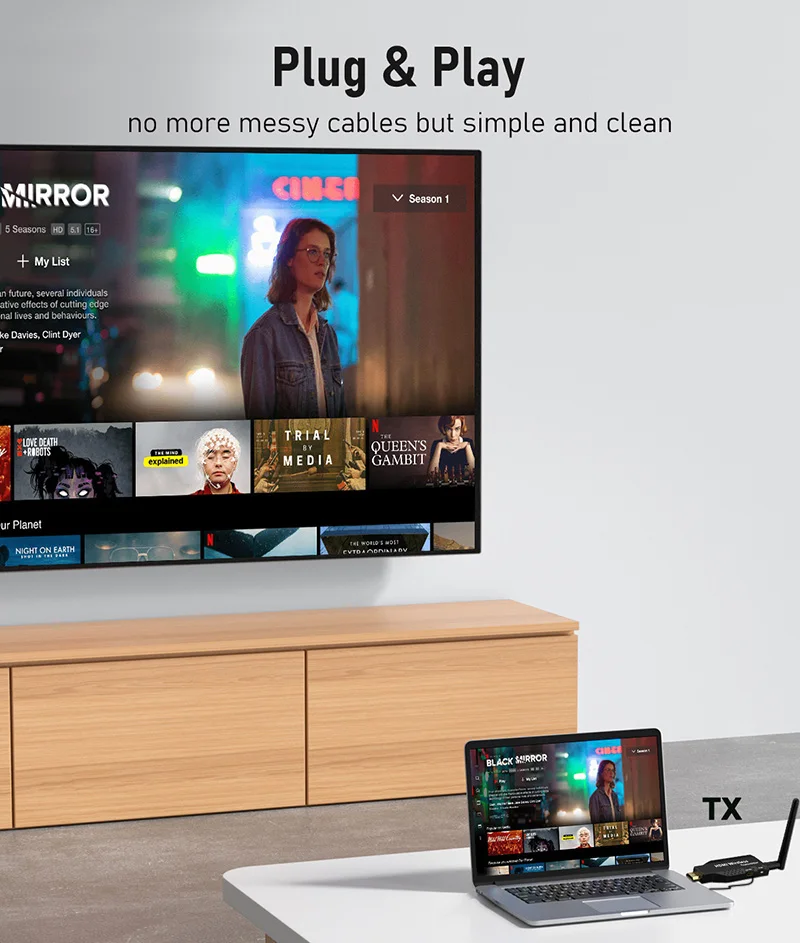 1. Transmisión de video y audio HDMI a través del protocolo de transmisión inalámbrica incorporado, sin necesidad de WiFi o internet