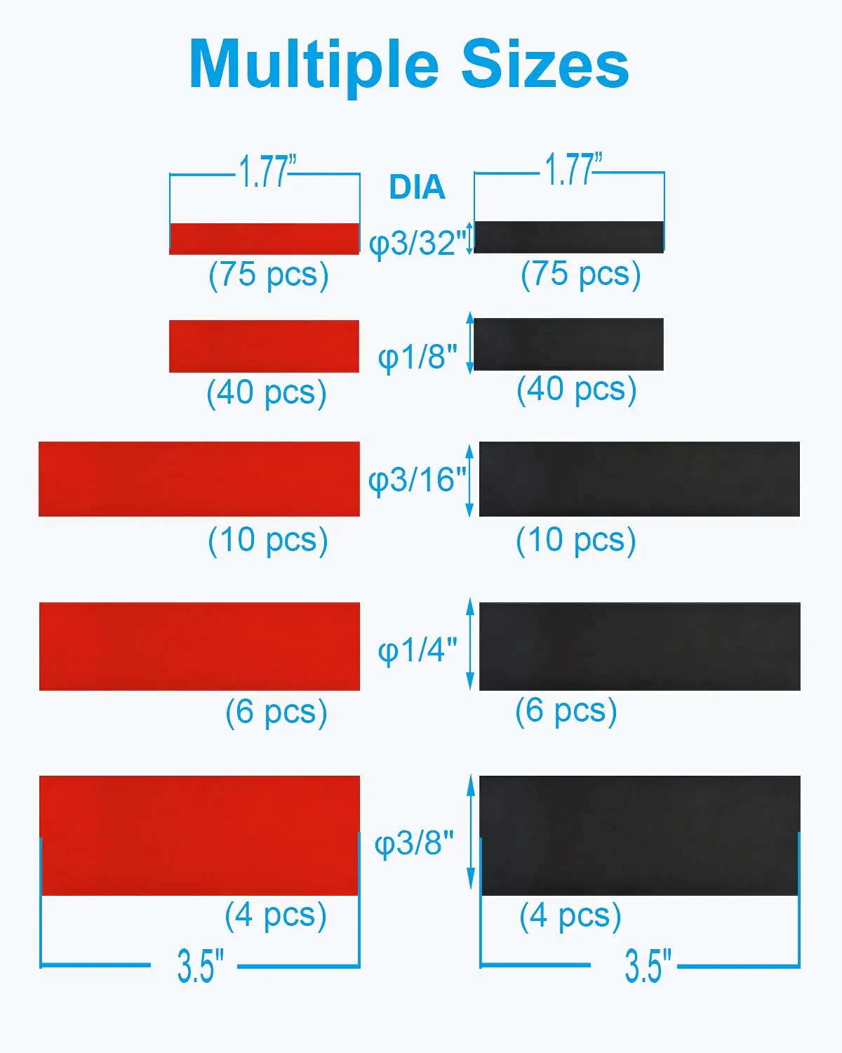 Lo que obtienes: un total de 270 tubos termorretráctiles, 5 tamaños, diámetro: 3/8"(8 piezas), 1/4"(12 piezas), 3/16"(20 piezas), 1/8"(80 piezas), 3/32"(150 piezas), Viene con una caja de almacenamiento, nuestro amigable servicio al cliente garantiza una experiencia de compra agradable