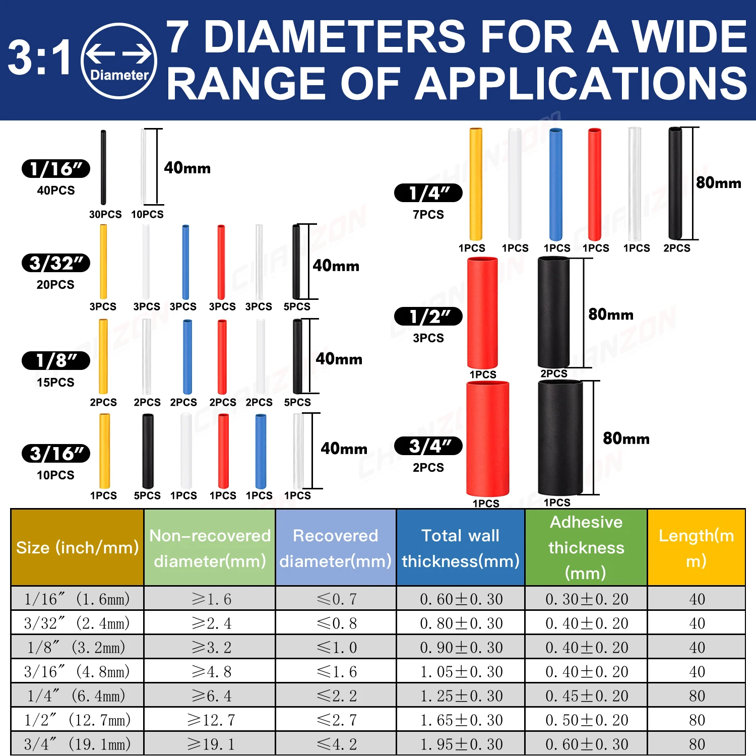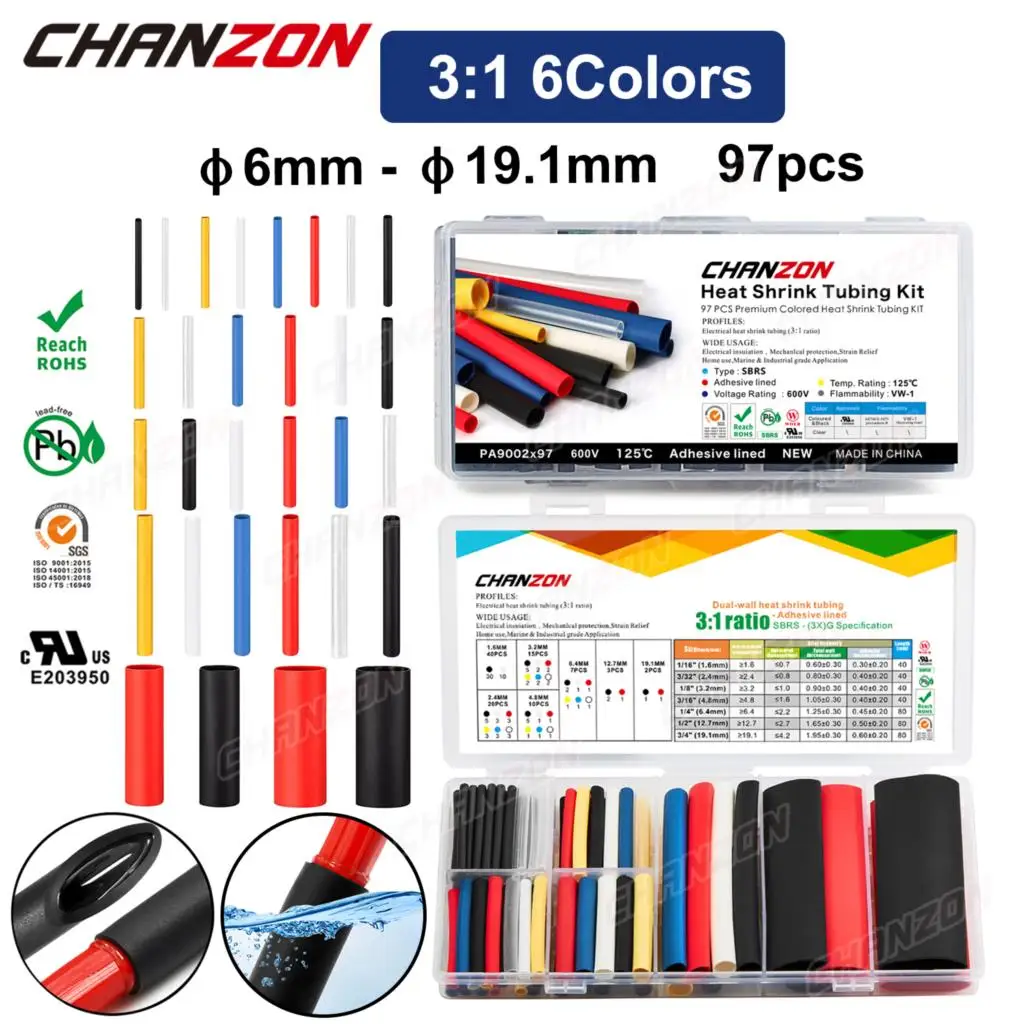 6 multicolor 7 tamaño 3:1 Kit de tubo termorretráctil con pegamento Protector de alambre forrado adhesivo de doble pared manguera de envoltura retráctil 97 Uds