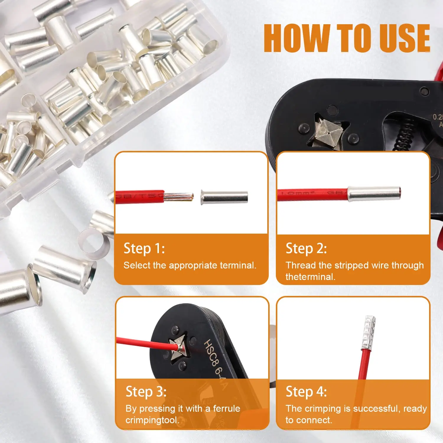 【Cómo utilizar】 Para obtener el mejor efecto de uso, utilice unos alicates para engarzar después del enchufe del cable, presione el terminal hasta que el diámetro se vuelva más pequeño y no haya espacio entre el terminal y el cable.
