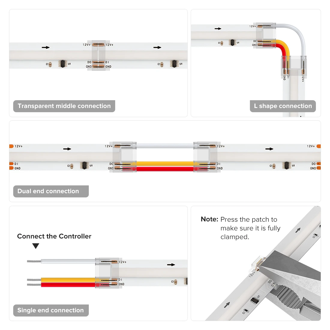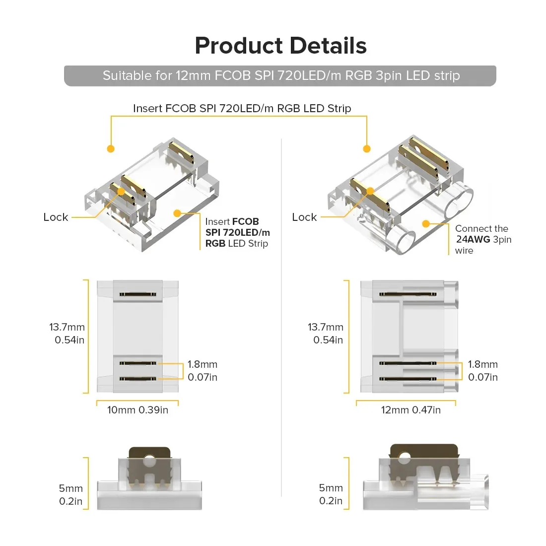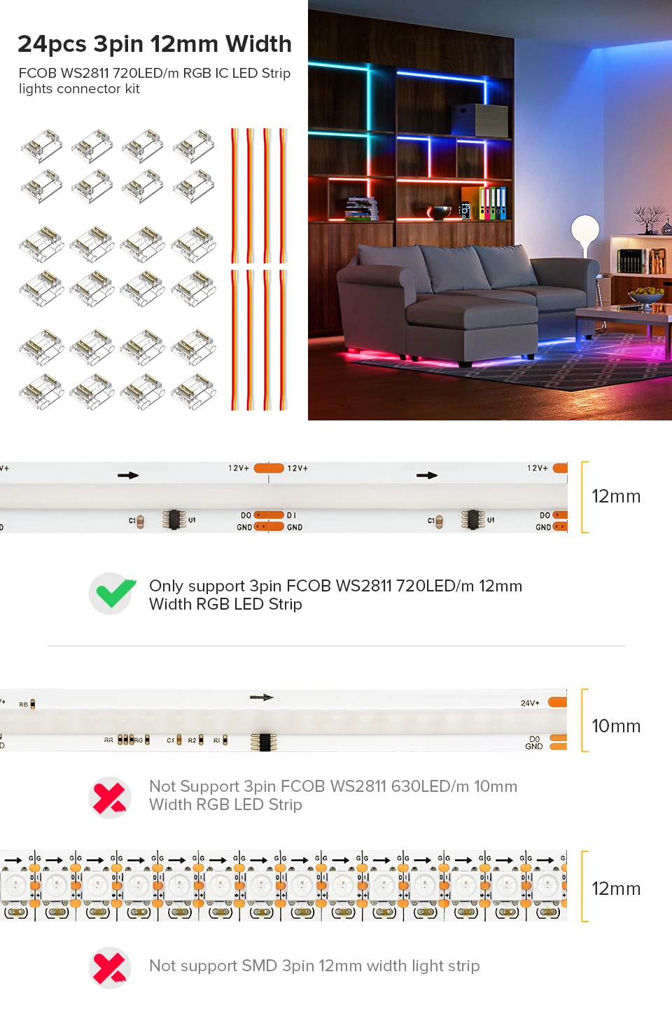 Kits de conectores de cubierta transparente de 12mm, 24, 3 pines, para tira de LED COB RGBIC, conectores transparentes sin huecos con cable de extensión de 5,9 pulgadas