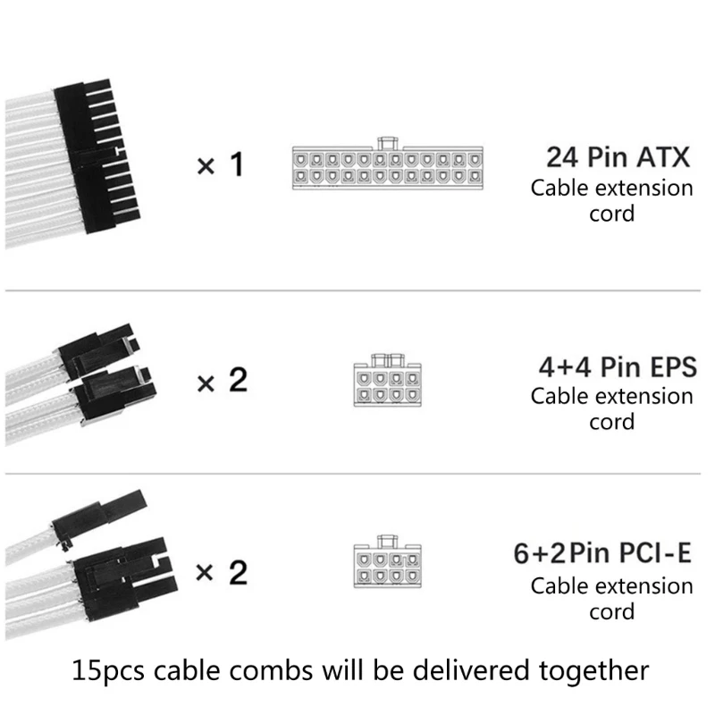 Características: contiene: 1 cable de extensión ATX de 24 Pines, 2 cables EPS de 4 + 4 pines, 2 cables PCI-e de 8 pines, 15 peines de cables.