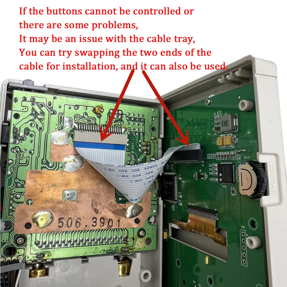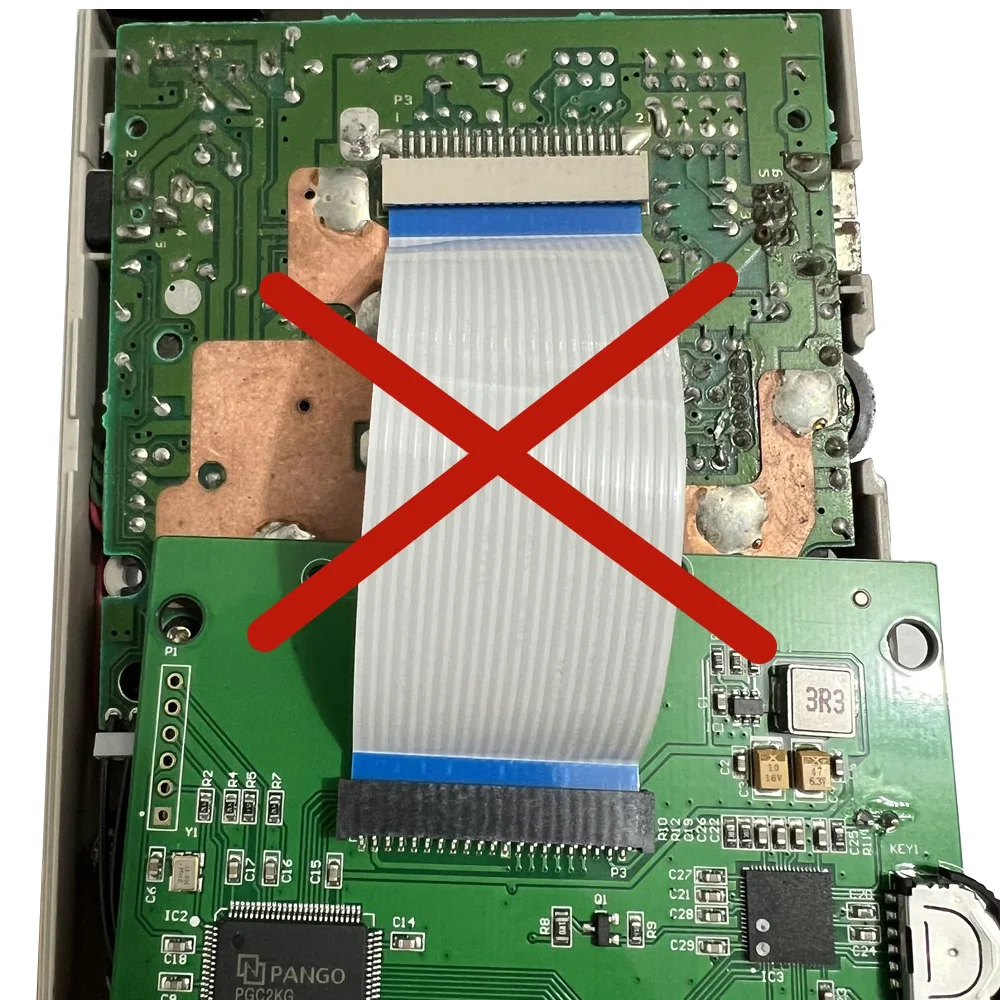 Nota:Al conectar este cable plano con la placa base, no inserte ambos extremos del cable plano en la misma dirección en el enchufe.Como se muestra a continuación.¡Insertar un cable inverso como este quemará el chip principal de la pantalla LCD!!
