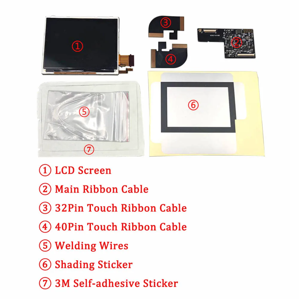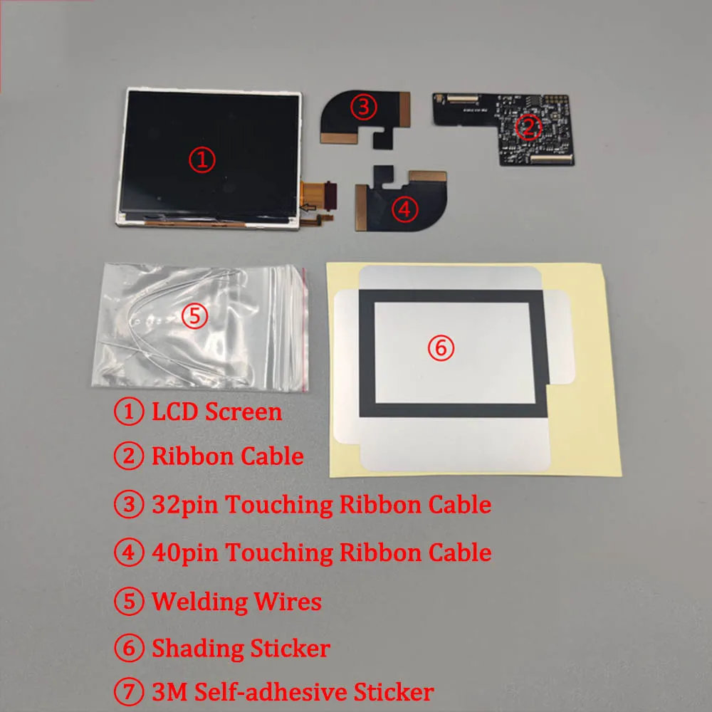 El paquete incluye:1 pantalla LCD2 cables de cinta3 Cable plano de 32 pines4 cables de cinta de 40 pines5 cables de soldadura6 pegatinas de sombreadoAdhesivo autoadhesivo 7 3M