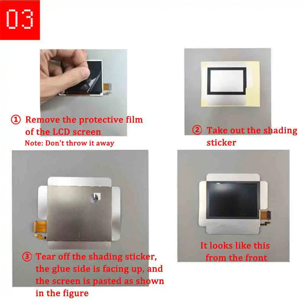8. Retire la pegatina de sombreado, el lado del pegamento mira hacia arriba y la pantalla se pega como se muestra en la figura;