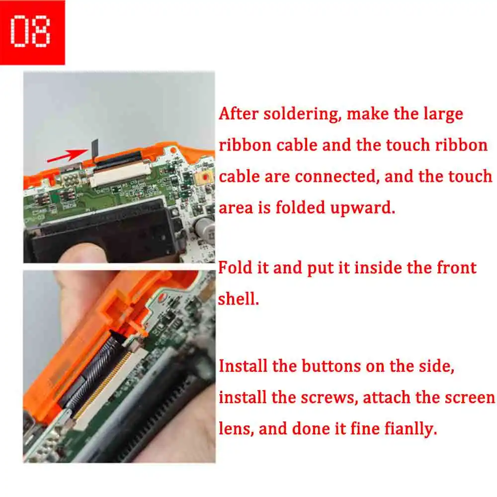 17.Después de soldar, haga que el cable plano grande y el cable plano táctil estén conectados, y el área táctil se pliega hacia arriba.