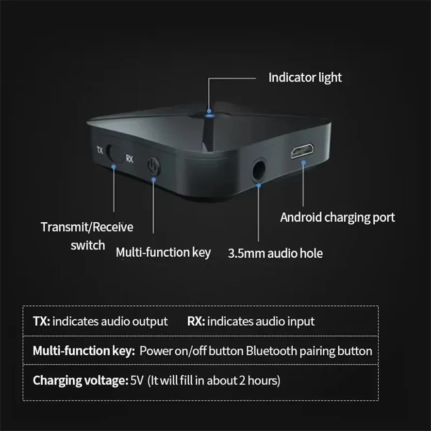 1.This extremely portable, lightweight wireless audio transmitter & receiver is an ideal wireless audio solution for a wide range of situations and uses2.Transmitter mode:wirelessly streams audio from your non-Bluetooth TV, home stereo system, or CD player to your Bluetooth headphones or speakers3.Receiver mode: wirelessly streams audio from your Bluetooth-enabled phone, tablet, or computer to your wired stereo, speakers, or headphones4.Switch between transmitter and receiver modes with the simple flick of a switch. Effortlessly connect using advanced Bluetooth technology and 3.5mm audio cable (included).5.Super-Portable Audio-Streaming PowerThe KN321 is just 44mm (1.73") across and weighs only 18g (0.63oz), but has got powerful wireless audio streaming capabilities. Slip this transmitter & receiver into your backpack or laptop bag and take it on-the-go without the slightest effort.6.Broad Compatibility: With the included 3.5mm cable and 3.5mm to 2RCA cable, this Receiver Transmitter adapter can widely be used on your computer, laptop, home stereo system, headphone, smartphone, Mp3 player, CD player, etc.Power on: Press and hold the power on/off button until the LED lights upShutdown: Press and hold the power on/off button until the LED is off Charging: Use the DC-5V charger and micro usb charging cable. The red light is on during charging. When the battery is fully charged, the blue light is on.