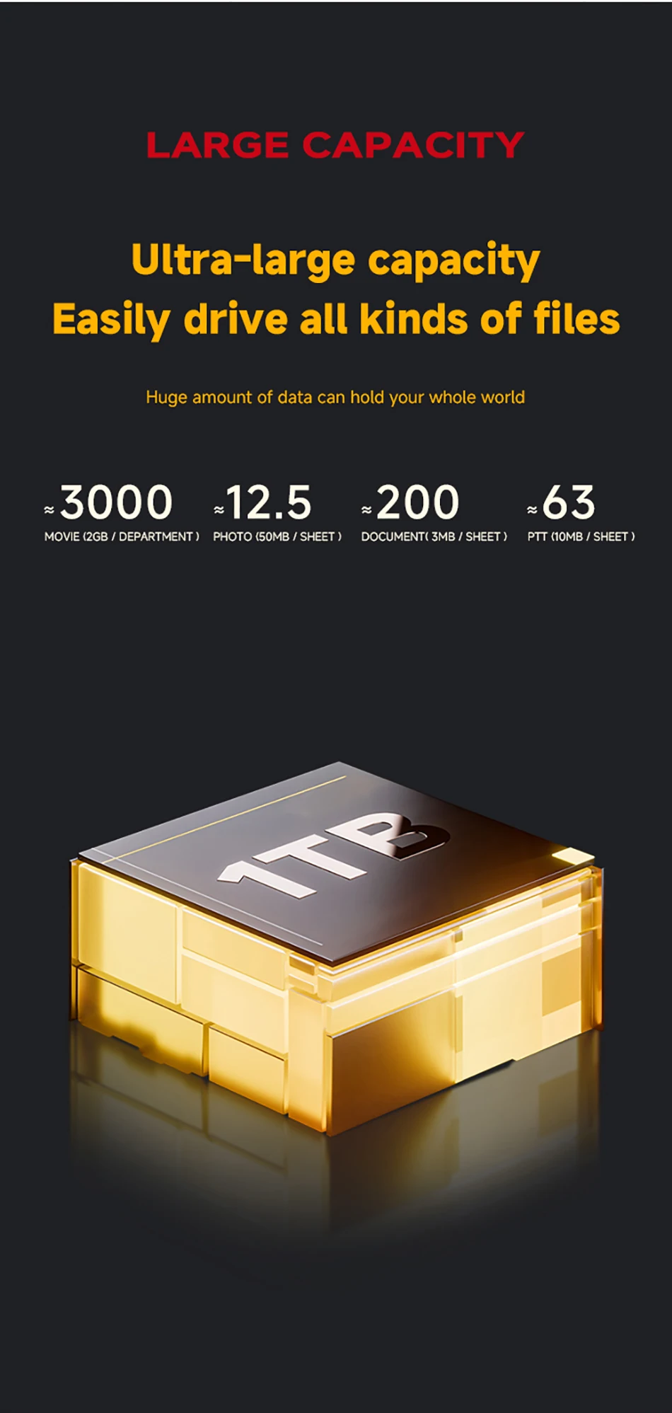 Gran capacidad, puede proporcionar un gran espacio de almacenamiento. Se pueden almacenar fácilmente fotografías, música, películas y datos.