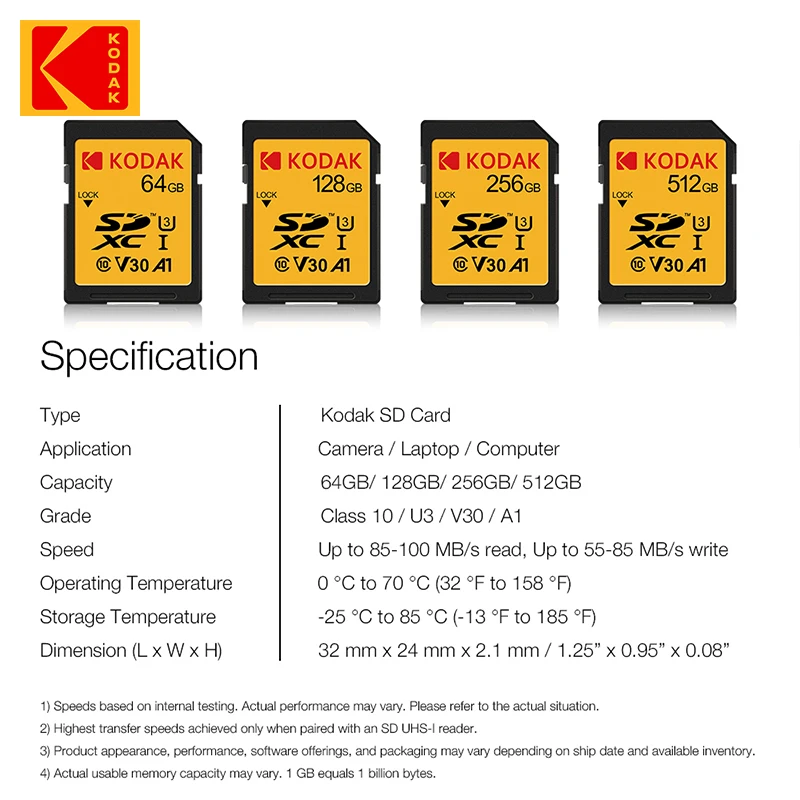 Comprar Kodak-tarjeta de memoria Extreme Pro, dispositivo SD de 32GB, 512GB, SDHC, 128GB, 64GB, 256GB, SDXC, cámara Clase 10, UHS-I, 100 MB/S, capacidad Real