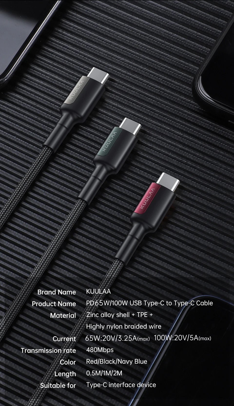 Nombre del producto: PD65W/100W USB tipo C a cable tipo C