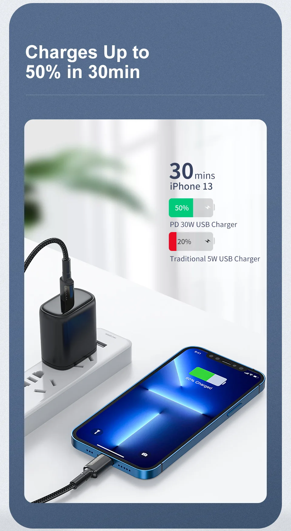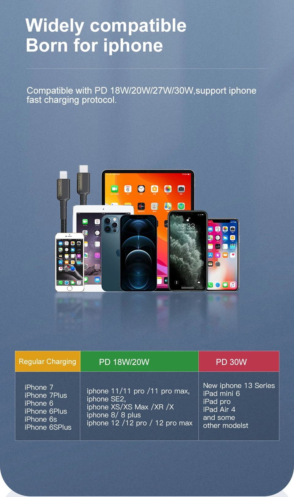 Compatible con PD 18W/20W/27W/30W, admite protocolo de carga rápida de iphone.