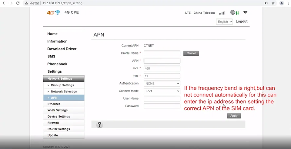 2. Si la banda de frecuencia de su tarjeta SIM es compatible con ella, pero su dispositivo no puede conectarse a Internet normalmente, debe desactivar el código PIN y modificar el APN.(la información puede consultar al operador)