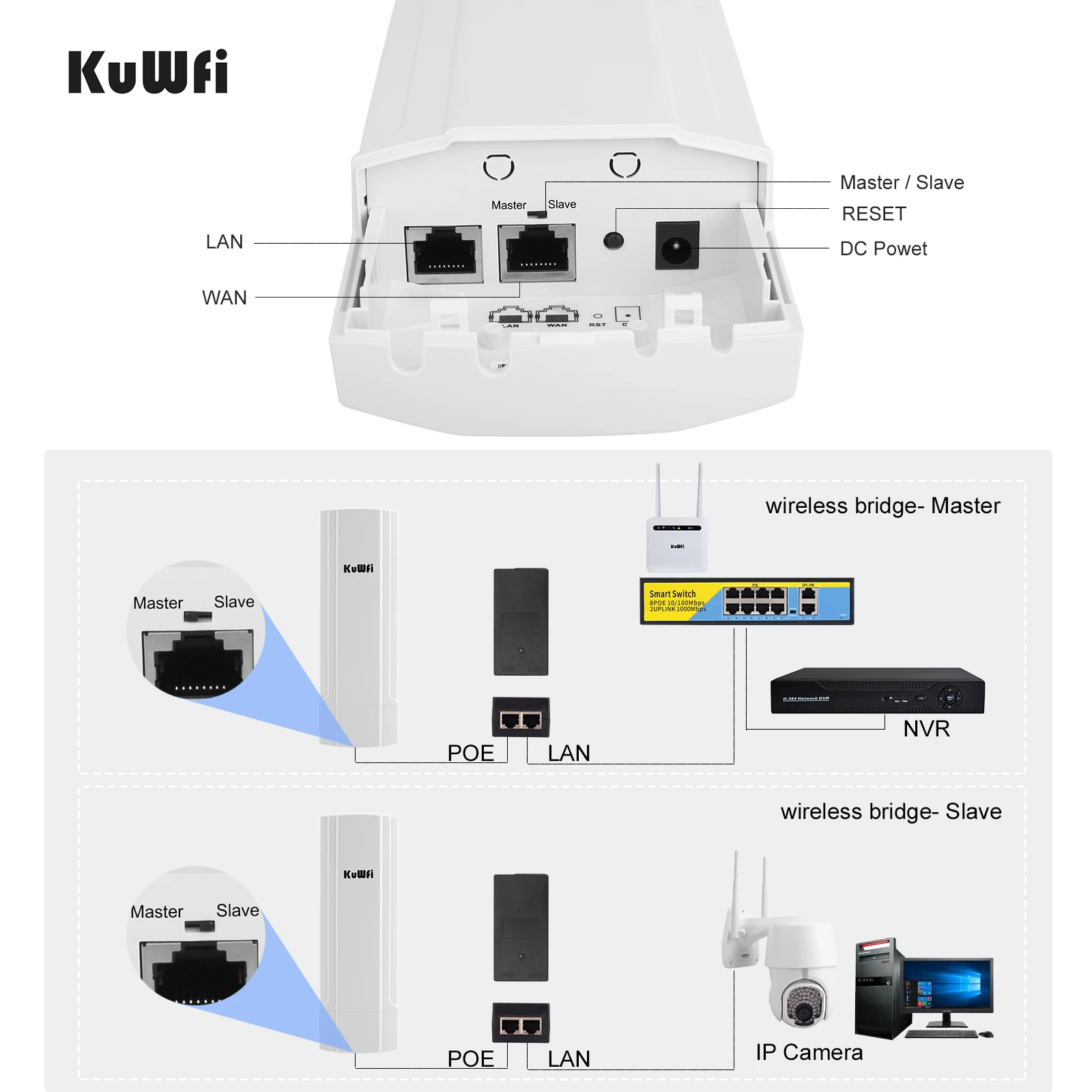 Puente exterior de alta potencia, más rango de cobertura Wifi Potencia RF de 512AC de hasta 25 dBm, equipada con antena de panel de 14 dBi, rango inalámbrico punto a punto de hasta 3-5 km de distancia.