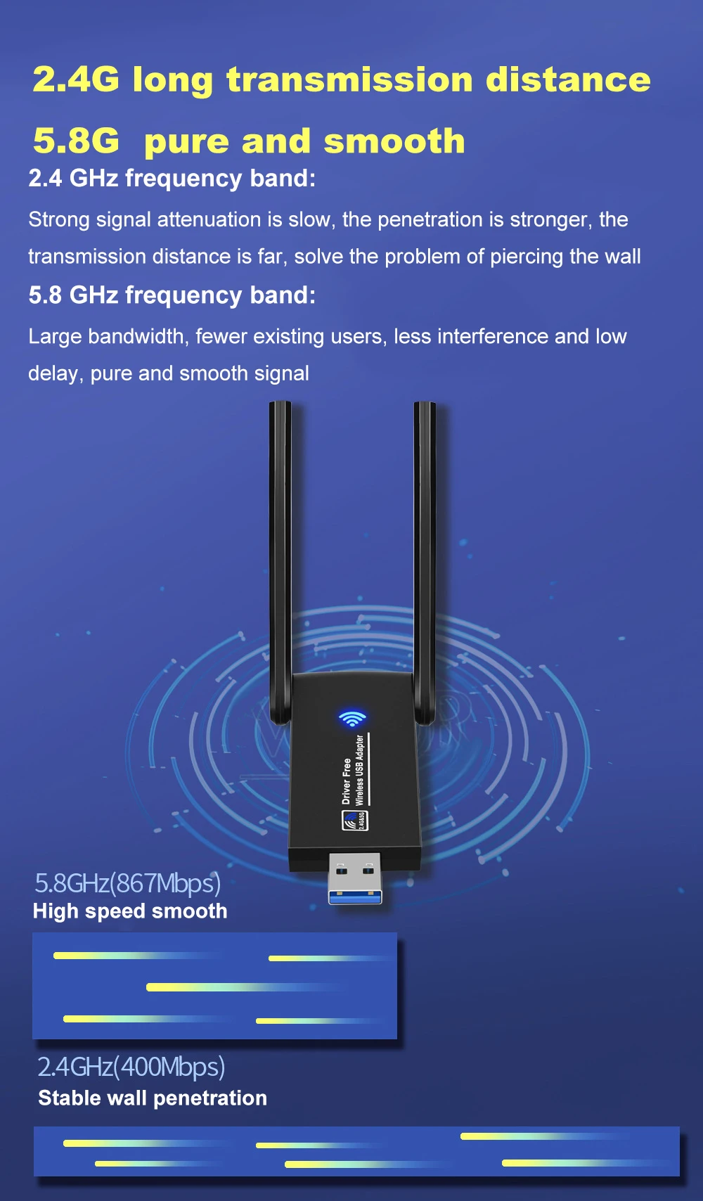 5. Soporte de velocidad de red (velocidad WiFi): 2,4 GHz - 400MPBS 5,8 GHz - 867MPBS