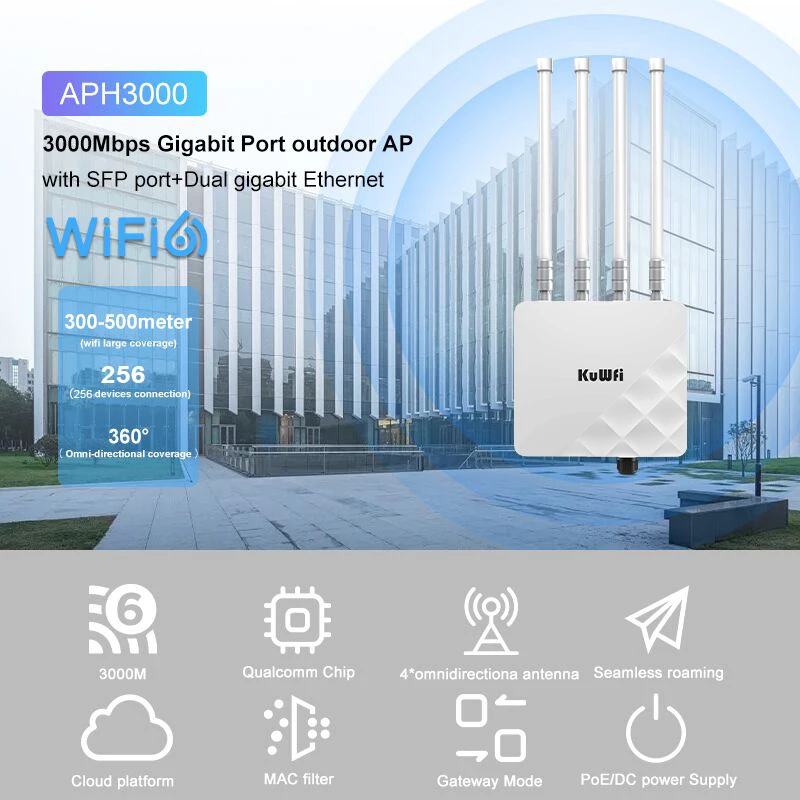 APH3000 tiene 4x 6dBi 2.Antenas Wi-Fi 4G/5G..Admite cobertura total de 360 grados de señales Wifi.Bajo la condición de que no haya interferencias, la distancia máxima de transmisión puede alcanzar los 300-500 metros.Los indicadores inalámbricos de alto rendimiento pueden obtener un área de cobertura inalámbrica más grande y un mejor rendimiento de penetración en la pared.