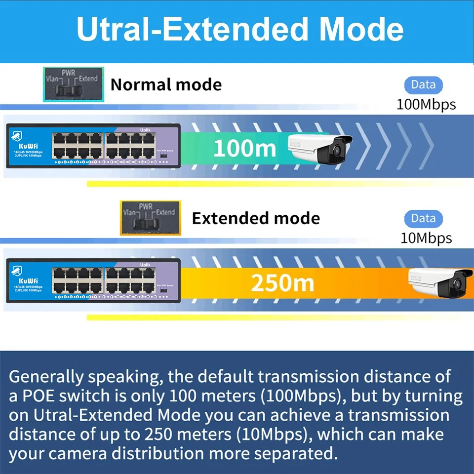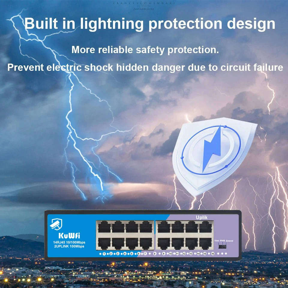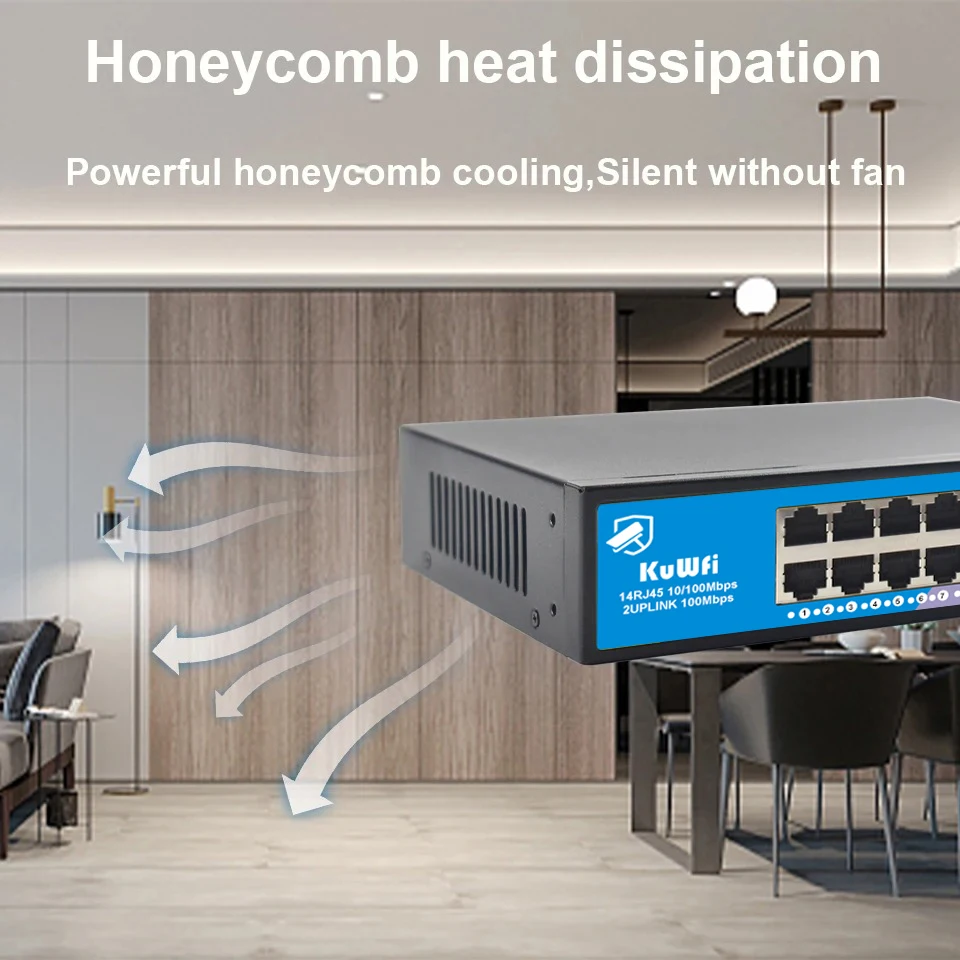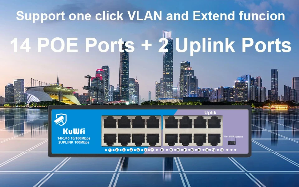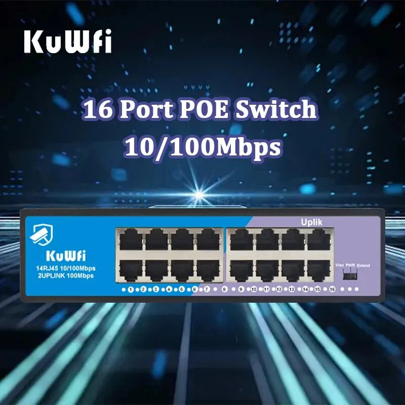 • 16 Puertos de Ethernet :El KuWFi POE Switch cuenta con 16 puertos de Ethernet, permitiendo conectar una gran cantidad de dispositivos para un rendimiento de red superior.