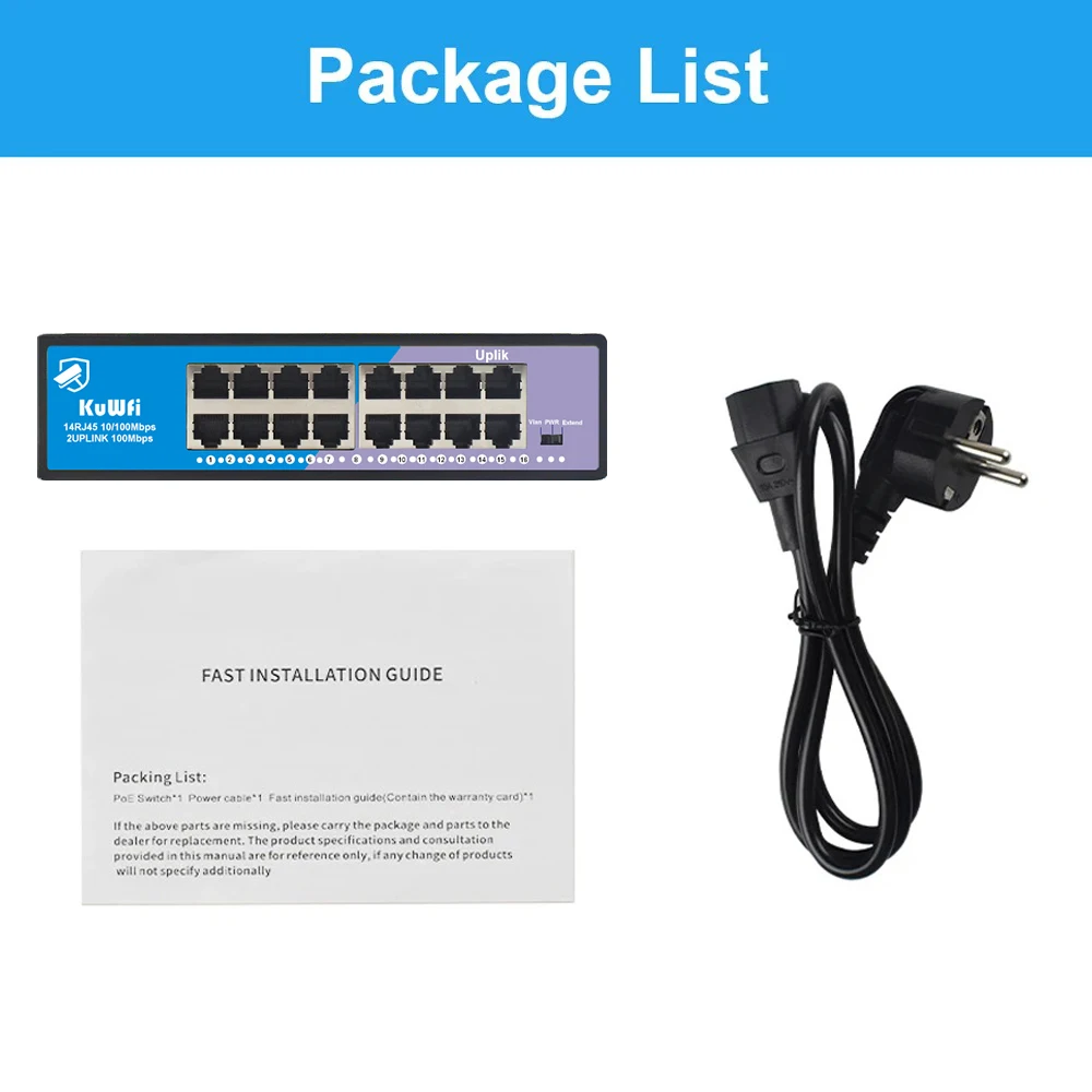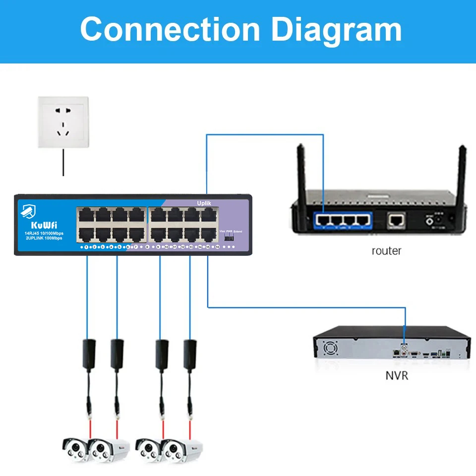 1. Para el modelo 1016b: Con VLAN function16-Port Poe Switch:16x10/100Mbps Poe puertos para la conexión de la Cámara IP de seguridad para la conexión Router/NVR, Plug & Play.