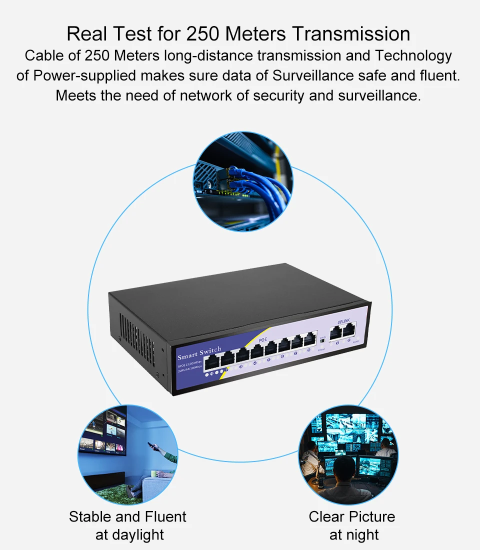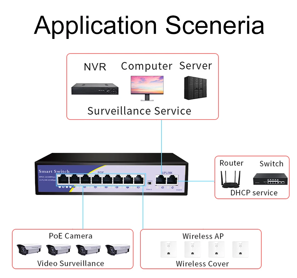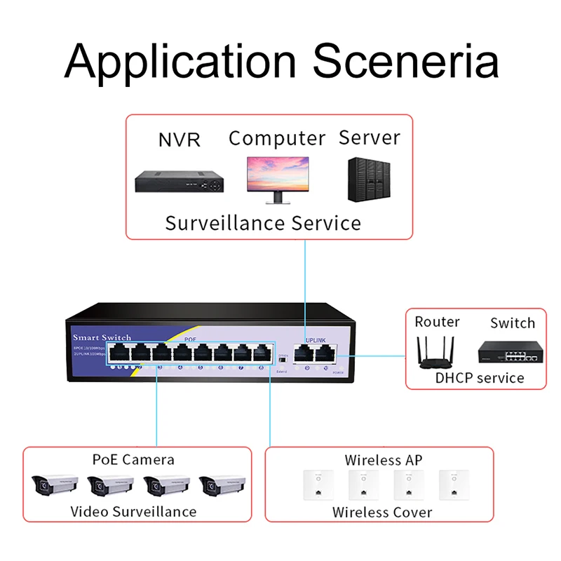 4. El conmutador PoE es ideal para alimentar dispositivos PoE como cámaras IP, puntos de acceso WLAN, teléfonos IP, sistemas de control de acceso de oficina, y otros dispositivos PD y ofrece una línea de productos de alta calidad que proporcionan una solución total para la aplicación Ethernet en diferentes entornos.