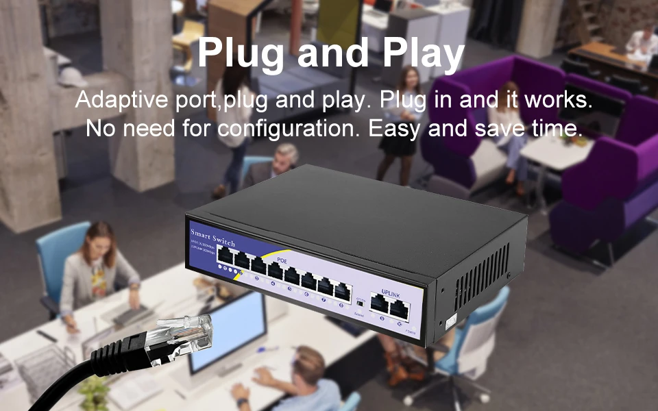 3. El interruptor PoE de 48V determina automáticamente los requisitos PoE, la velocidad, el dúplex y el tipo de cable mediante el enlace ascendente automático. Fácil de operar y confiable.