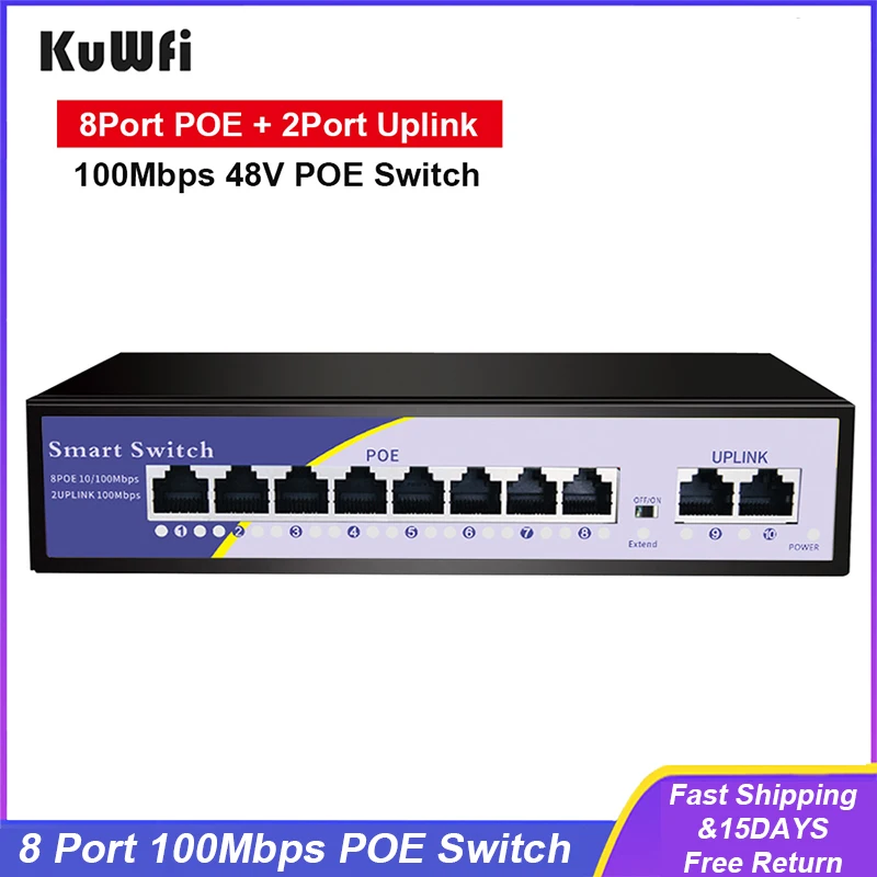 Comprar KuWFi-conmutador POE de 48V, 8 puertos de 100Mbps, conmutador Ethernet IEEE 802,3 af/at, adecuado para cámara IP/ENRUTADOR AP inalámbrico