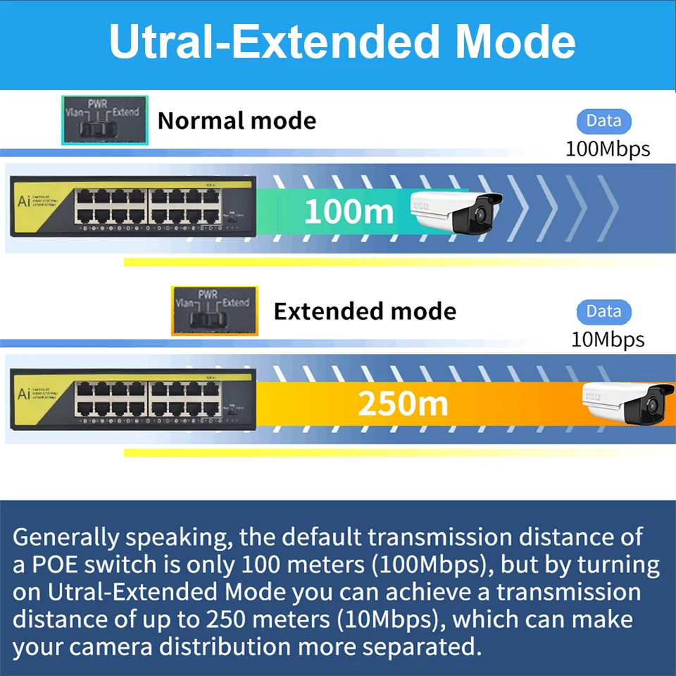 La distancia de transmisión predeterminada de un conmutador PoE es de solo 100 metros (100Mbps), al activar el modo Utral-Extend, puede alcanzar una distancia de transmisión de hasta 250 metros (10Mbps), lo que puede hacer que la distribución de su Cámara esté más separada.