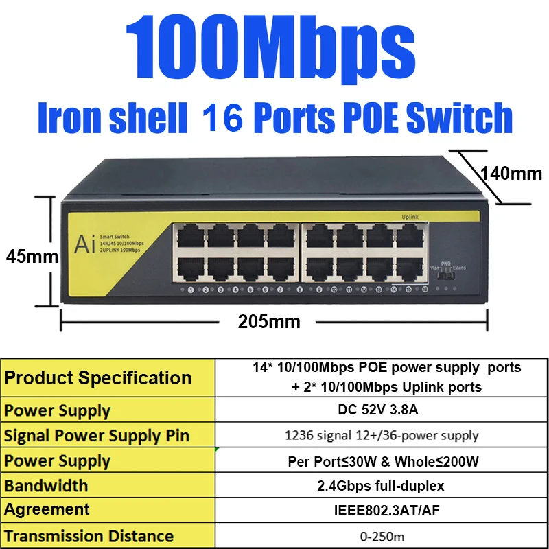 Este es un interruptor POE estándar de 48V con protocolo IEEE802.3af/AT. Adopta el último chip de conmutación Ethernet de alta velocidad y tiene capacidades de procesamiento de datos extremadamente rápidas para mejorar el rendimiento de transmisión de datos sin problemas, con puertos de red de suministro de energía, 2 puertos de enlace ascendente RJ45. Entre ellos, todos los puertos RJ45 admiten fuente de alimentación de cable de red.
