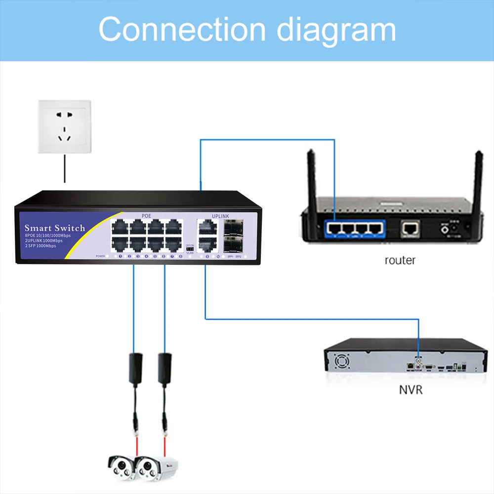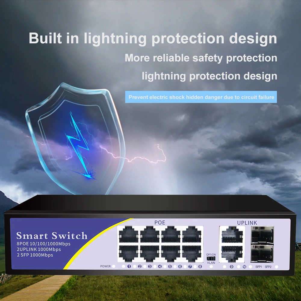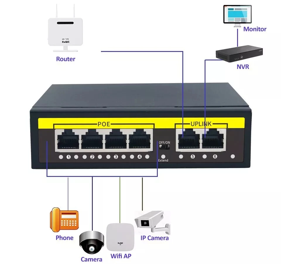 5.PoE switch is ideal for powering PoE devices such as IP cameras, WLAN access point, IP phones, office access control systems, and other PD devices and offers a line of high quality products