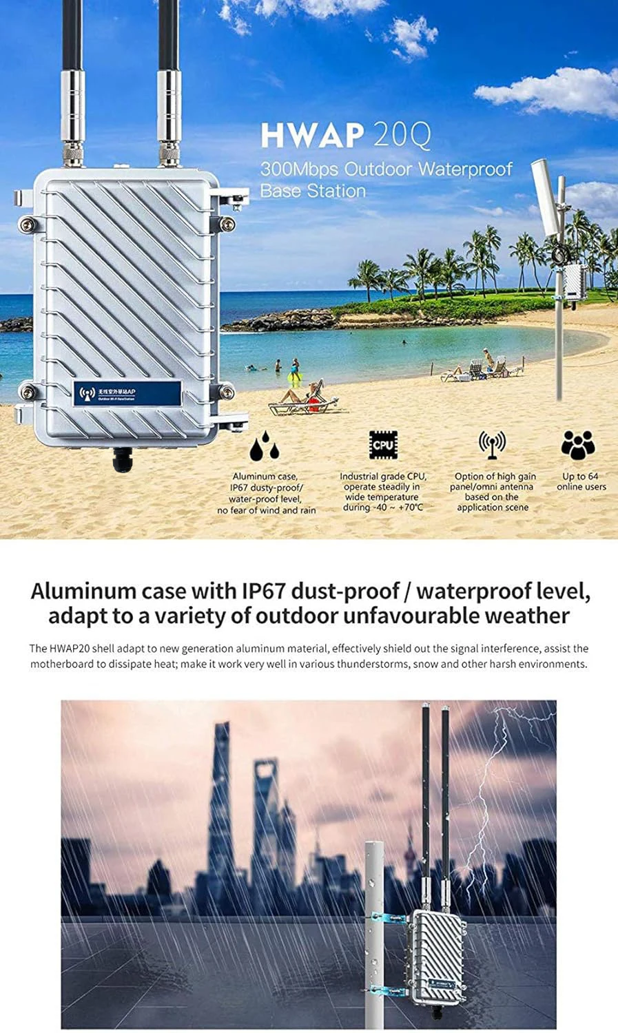 Nota: desde el 9 de noviembre de 2021, nuestra antena han cambiado de los parámetros de la siguiente manera: Longitud: 35cm, diámetro: 2cm, ganancia de antena de 2,4G: 8dBi.1. El enrutador AP20 es un enrutador/CPE/AP/Repetidor para exteriores de alto rendimiento con Chipset Qualcomm2. Con antena omnidireccional exterior desmontable y alta potencia RF ajustable, hace que este punto de acceso exterior con cobertura WiFi sea de hasta 400 metros.3. Es compatible con AP inalámbrico, puerta de enlace, repetidor WiFi, modo de operación WISP, solución efectiva para la aplicación de cobertura WiFi de largo alcance al aire libre.4. Enrutador AP20 de 300Mbps con carcasa metálica para exteriores para evitar daños causados por la lluvia, el polvo, el sol y el clima de tormenta, adaptable a varios entornos también.5.AP20 está diseñado para proporcionar soluciones WISP, CPE y solución de red inalámbrica de largo alcance para videovigilancia y transmisión.¿Cómo funciona?1. Deslice las correas a través de las ranuras en la parte posterior del AP/enrutador y Apriete las correas alrededor del orificio.2. Conecte un extremo de un cable LAN al puerto PoE del inyector y el otro extremo del cable de alimentación proporcionado LAN al puerto LAN del AP/ENRUTADOR.3. Utilice otro cable LAN para conectar el puerto LAN de la fuente de alimentación.4. Conecte el adaptador de corriente a un enchufe de pared.Características:Tecnología MIMO, velocidad de datos de 300MbpsCumple con el estándar IEEE 802.11b/G/n, frecuencia de 2,4 GHz, Protocolo 2T2R con velocidad de datos de 300MbpsTecnología MIMO inalámbrica IEEE 802.11b/G/n, 2T2R 300MbpsInterfaz 1*10/100Mbps Puerto RJ451 * Botón de reinicio para restaurar los valores predeterminados de fábricaAntena: Antena omnidireccional para uso en exterioresIndicador LED: alimentación, WIFIPotencia: 24V PoEModo de operación: Gateway, repetidor, WISP, APProtocolo de red: IEEE 802,3 (Ethernet)IEEE 802.3u(Fast Ethernet)IEEE 802.11b/G/nSeguridad inalámbrica: WEP 128/152/BITCifrado personal WPA/WPA2 (usando TKIP o AES, en el caso de que sea así)Cifrado empresarial WPA/WPA2 (usando TKIP, por lo general)Medio ambienteTemperatura de funcionamiento: 0 °C ~ 55 °CTemperatura de almacenamiento: -20 °C ~ 70 °CHumidityHumedad operativa 5% ~ 95% RH Sin condensaciónHumedad de almacenamiento 5% ~ 95% RH Sin condensaciónTiempo de envío y seguimiento