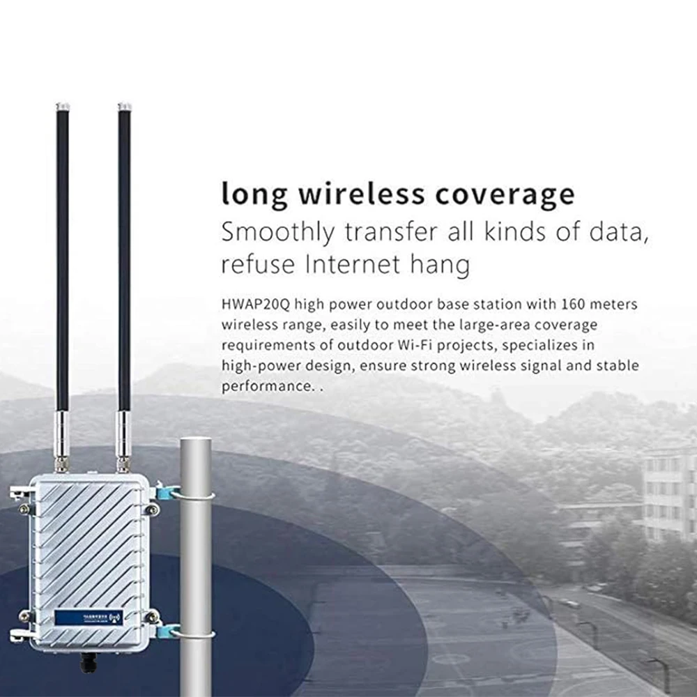Nota: desde el 9 de noviembre de 2021, nuestra antena han cambiado de los parámetros de la siguiente manera: Longitud: 35cm, diámetro: 2cm, ganancia de antena de 2,4G: 8dBi.1. El enrutador AP20 es un enrutador/CPE/AP/Repetidor para exteriores de alto rendimiento con Chipset Qualcomm2. Con antena omnidireccional exterior desmontable y alta potencia RF ajustable, hace que este punto de acceso exterior con cobertura WiFi sea de hasta 400 metros.3. Es compatible con AP inalámbrico, puerta de enlace, repetidor WiFi, modo de operación WISP, solución efectiva para la aplicación de cobertura WiFi de largo alcance al aire libre.4. Enrutador AP20 de 300Mbps con carcasa metálica para exteriores para evitar daños causados por la lluvia, el polvo, el sol y el clima de tormenta, adaptable a varios entornos también.5.AP20 está diseñado para proporcionar soluciones WISP, CPE y solución de red inalámbrica de largo alcance para videovigilancia y transmisión.¿Cómo funciona?1. Deslice las correas a través de las ranuras en la parte posterior del AP/enrutador y Apriete las correas alrededor del orificio.2. Conecte un extremo de un cable LAN al puerto PoE del inyector y el otro extremo del cable de alimentación proporcionado LAN al puerto LAN del AP/ENRUTADOR.3. Utilice otro cable LAN para conectar el puerto LAN de la fuente de alimentación.4. Conecte el adaptador de corriente a un enchufe de pared.Características:Tecnología MIMO, velocidad de datos de 300MbpsCumple con el estándar IEEE 802.11b/G/n, frecuencia de 2,4 GHz, Protocolo 2T2R con velocidad de datos de 300MbpsTecnología MIMO inalámbrica IEEE 802.11b/G/n, 2T2R 300MbpsInterfaz 1*10/100Mbps Puerto RJ451 * Botón de reinicio para restaurar los valores predeterminados de fábricaAntena: Antena omnidireccional para uso en exterioresIndicador LED: alimentación, WIFIPotencia: 24V PoEModo de operación: Gateway, repetidor, WISP, APProtocolo de red: IEEE 802,3 (Ethernet)IEEE 802.3u(Fast Ethernet)IEEE 802.11b/G/nSeguridad inalámbrica: WEP 128/152/BITCifrado personal WPA/WPA2 (usando TKIP o AES, en el caso de que sea así)Cifrado empresarial WPA/WPA2 (usando TKIP, por lo general)Medio ambienteTemperatura de funcionamiento: 0 °C ~ 55 °CTemperatura de almacenamiento: -20 °C ~ 70 °CHumidityHumedad operativa 5% ~ 95% RH Sin condensaciónHumedad de almacenamiento 5% ~ 95% RH Sin condensaciónTiempo de envío y seguimiento