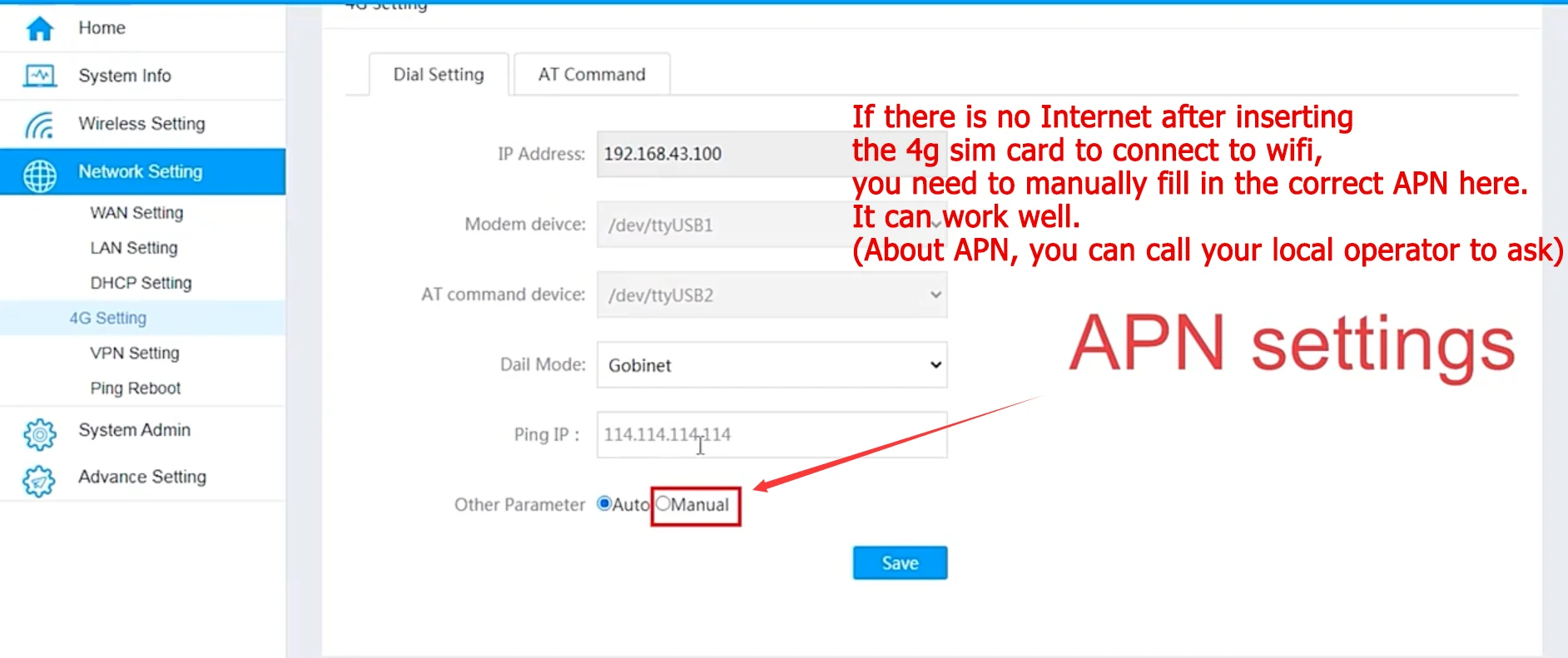 Elija el modo de módem inalámbrico 3G/4G por defecto, ingrese a la tarjeta SIM estándar, el enrutador 4g lte identificará 3G/4G automáticamente. Para algunas tarjetas SIM se debe actualizar APN.