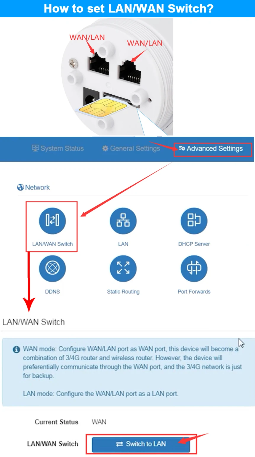 A1: Users need to log in to the WEB UI to switch WAN/LAN functions. As shown in the following picture.