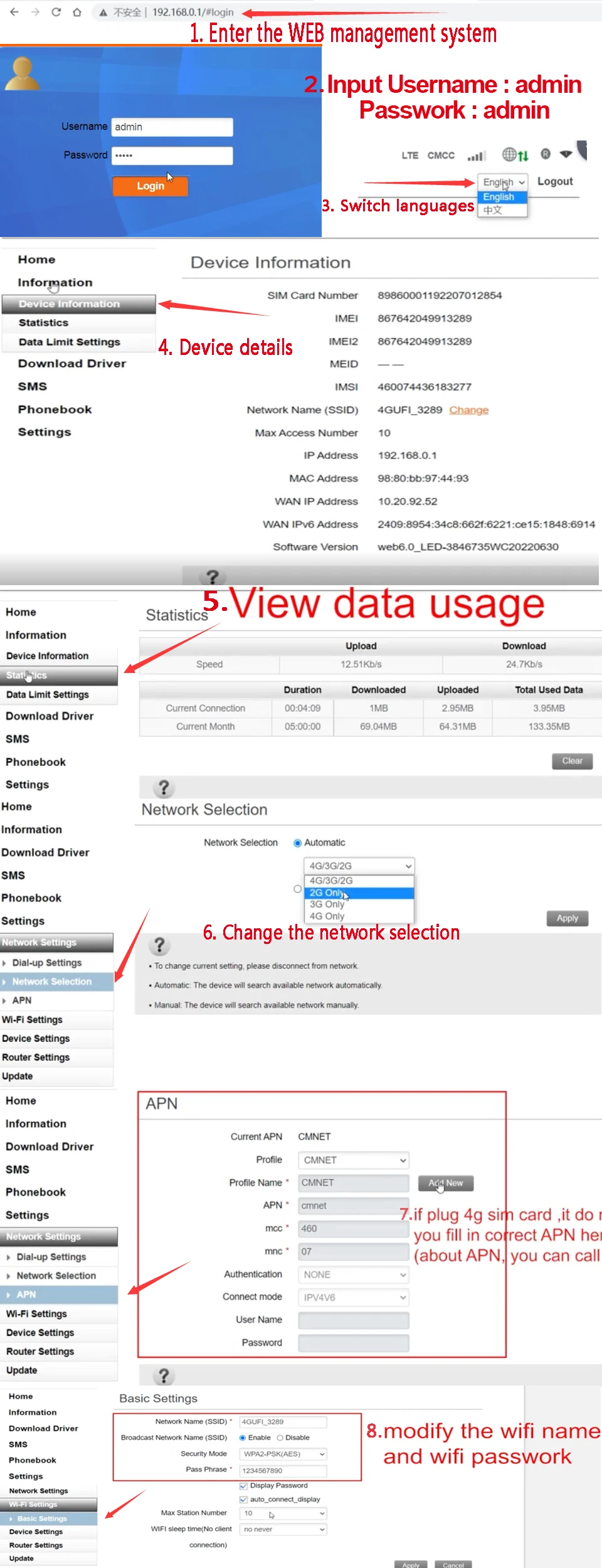 5. a WiFi Conéctese, abra 192.168.0.1 en el navegador para ingresar a la interfaz de usuario web, la interfaz de usuario Web puede modificar el nombre y la contraseña de WiFi para agregar APN.