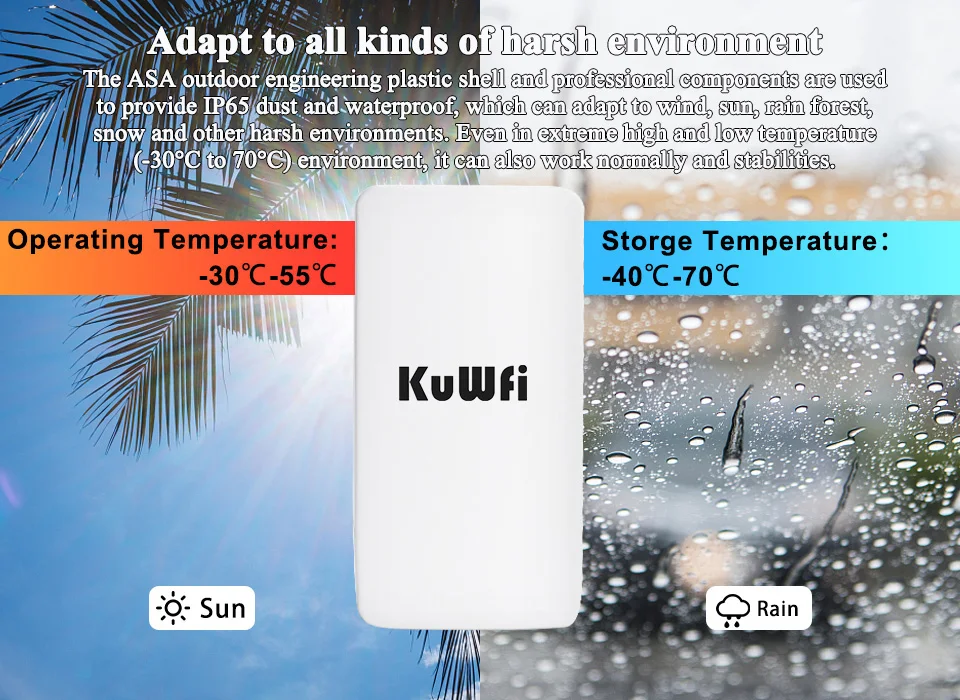 Utilizando una carcasa de plástico de ingeniería exterior ASA y componentes profesionales, para proporcionar polvo de nivel IP65, resistencia al agua, adaptarse al viento, exposición al sol, selva tropical, congelación de nieve y otros entornos hostiles, incluso en temperaturas extremadamente altas y bajas (-30°C a 70°C), el entorno también puede ser un trabajo normal y estable.