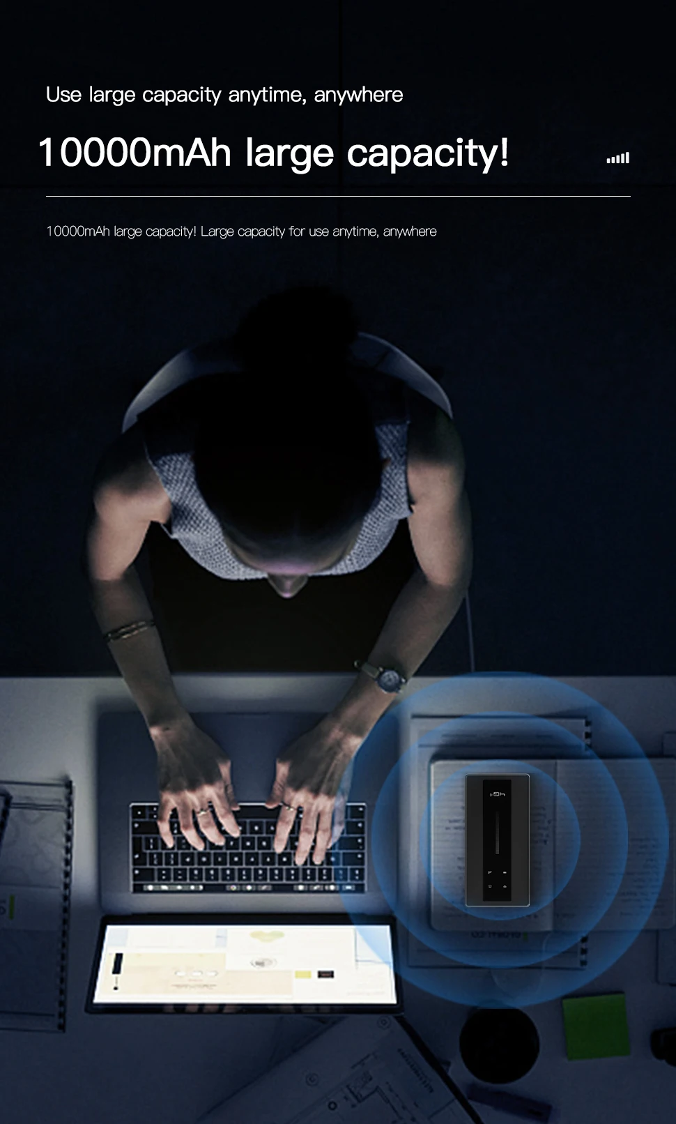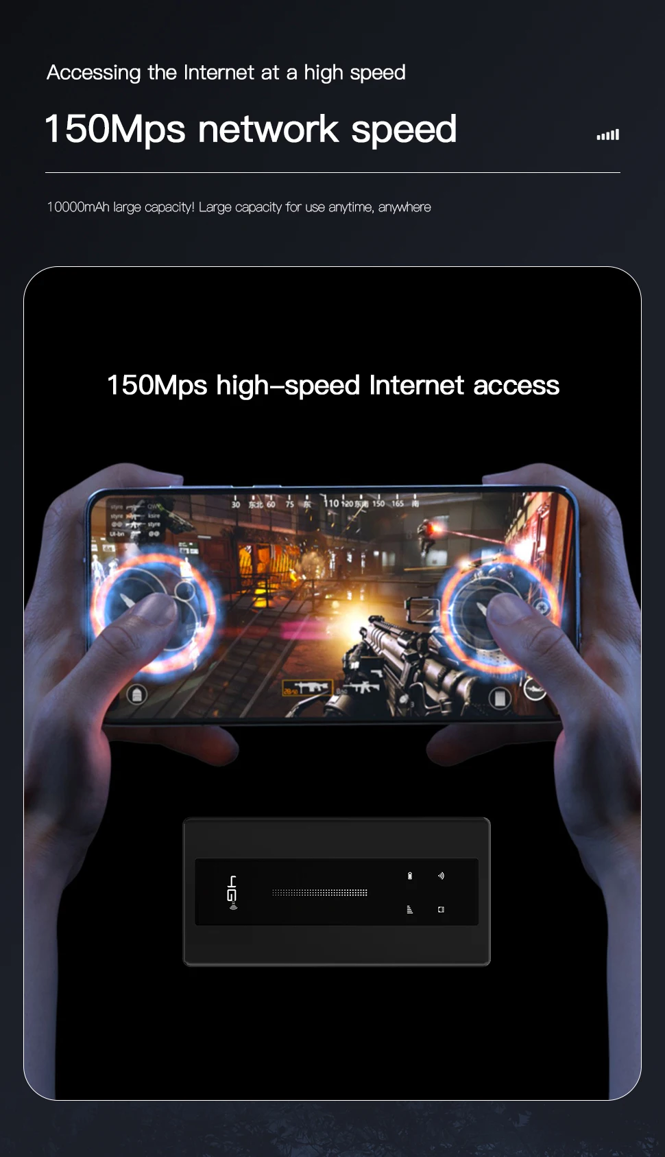 La batería incorporada de gran capacidad de 10000 mAh prolonga el tiempo de uso del enrutador.Cuando se usa en exteriores, no hay necesidad de preocuparse de que la batería se agote rápidamente. Después de pruebas exhaustivas, el enrutador puede continuar funcionando durante 18 a 24 horas con una carga completa.