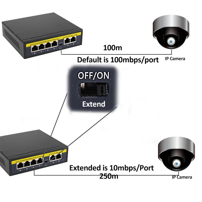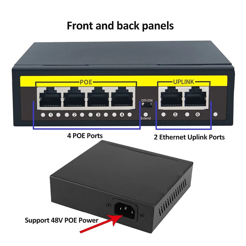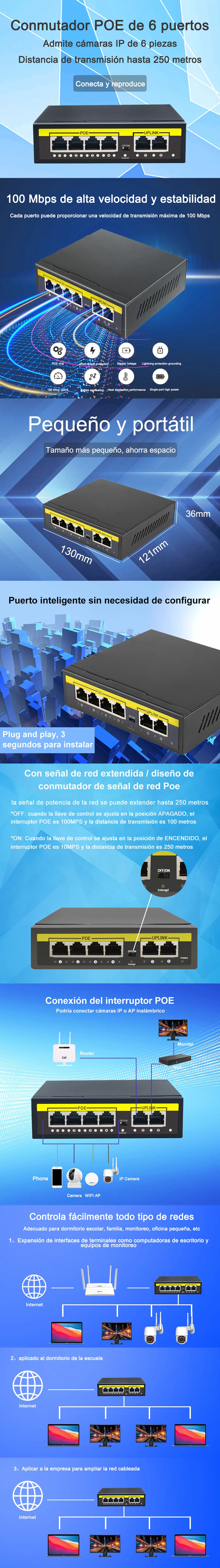 1.Interruptor PoE de 1,4 puertos: 4x10/100 Mbps puertos PoE para conexión de cámara IP de seguridad + 2x100/1000Mbps puertos Ethernet de subida rápidos para enrutador/conexión NVR, Plug & Play.