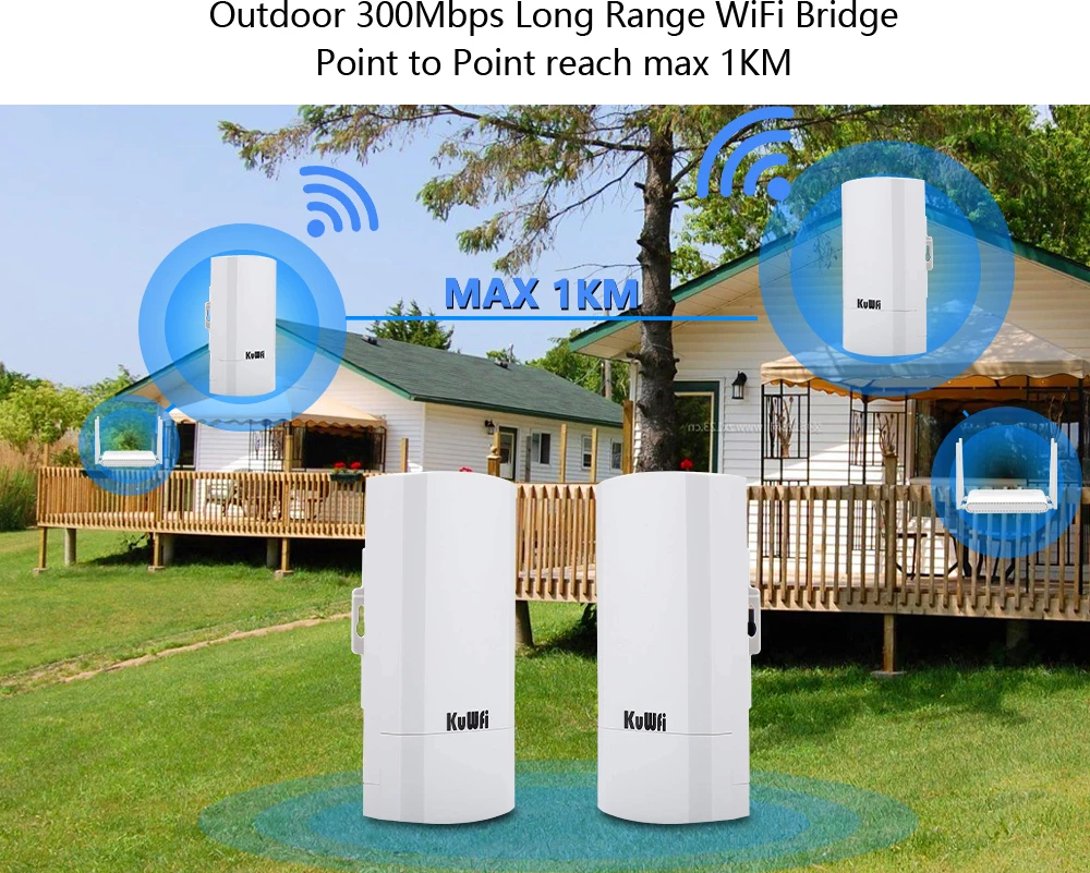 KuWFi Outdoor Wifi Bridge Router 300Mbps Wireless Router Repetidor/Wifi Bridge Cobertura Wifi de largo alcance 2.4Ghz Punto a punto 1KM Exterior CPE AP Bridge 24V POE LAN & WAN