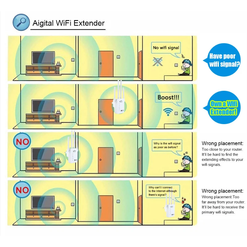 5.¡Se eliminará todo el lado ciego de la casa con una débil cobertura Wi-Fi!Se adapta a cualquier tipo de casa, extiende la señal inalámbrica hasta donde no haya ninguna señal antes o áreas difíciles de conectar para su hogar y oficina.