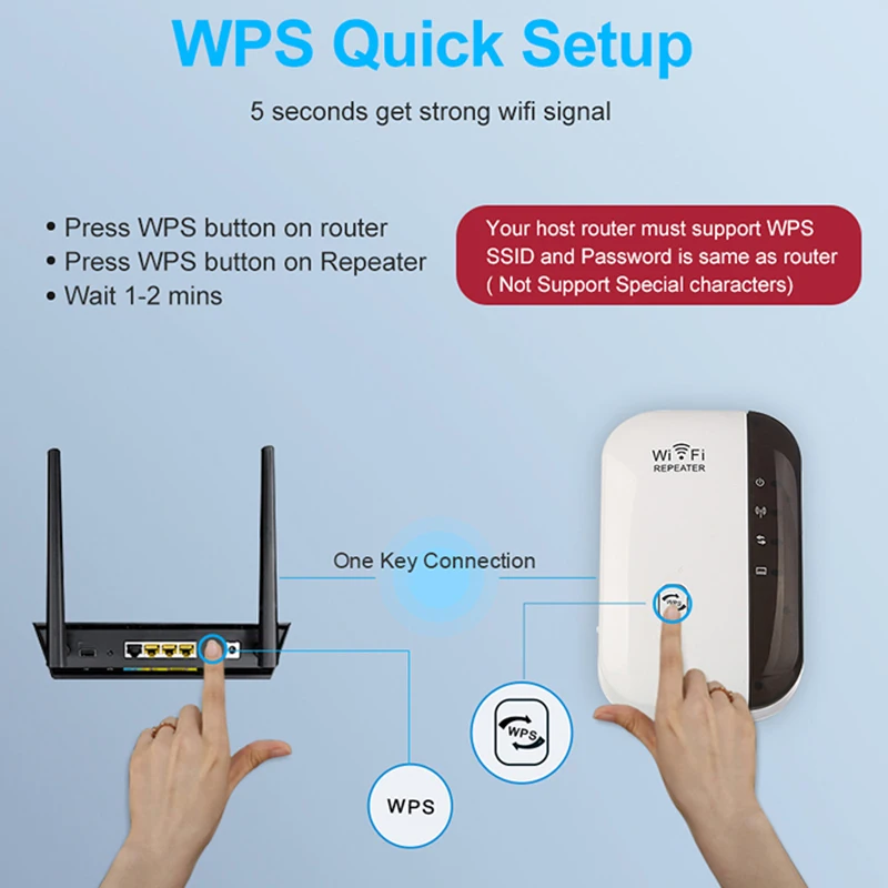 【FUNCIÓN WPS】: Este repetidor WiFi admite conexión WPS, se conecta con un solo toque y no es necesario introducir la contraseña, es práctico para los clientes.