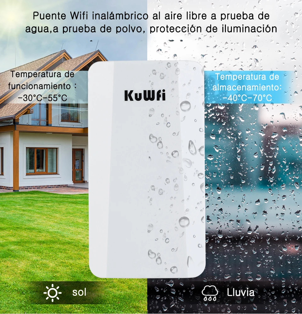 3.El puente ethernet inalámbrico KuWFi utiliza una carcasa a prueba de polvo e impermeable, protector solar para todo clima, diseño de sello a prueba de agua y polvo que se puede usar en varios trabajos al aire libre en el medio ambiente.