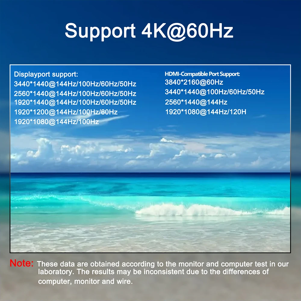 Rango de resolución de hasta 3840*2160 @ 60Hz , 4K @ 60Hz ; 1440P @ 165Hz144Hz 、 120Hz 、 60Hz; 1080P @ 165Hz , 144Hz, 120Hz, 60Hz (dependiendo del sistema y