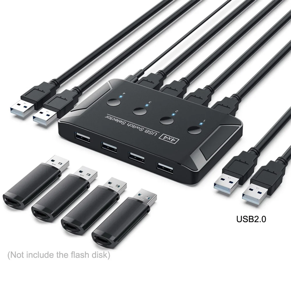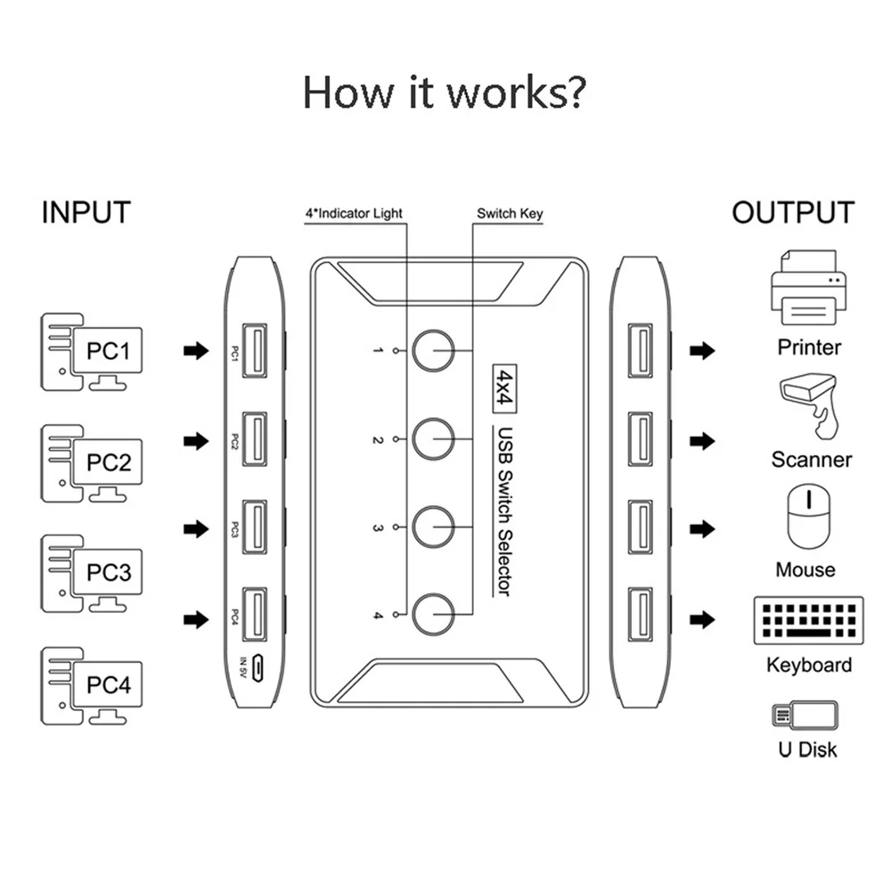 Comprar KVM-Selector de interruptor USB 2,0, 4 puertos para compartir piezas, 4 Dispositivos para teclado, ratón, escáner, impresora