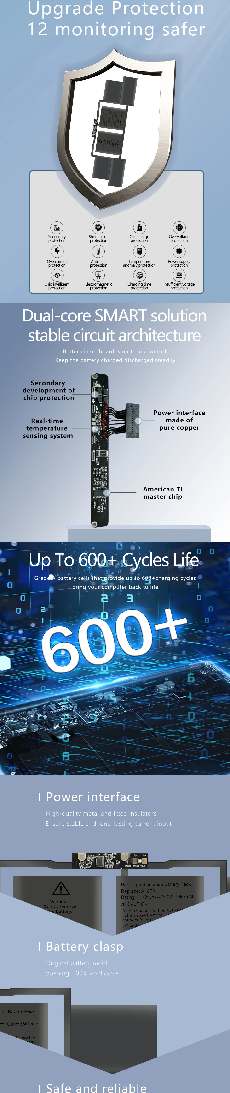 La Placa de protección de batería utiliza medidores de combustible de batería TI avanzados, proporciona protección de seguridad de primer y segundo nivel, contra sobretensión, subtensión, sobrecorriente, corriente de cortocircuito, sobrecarga y condiciones de sobretemperatura, así como otras fallas relacionadas con el paquete y la celda