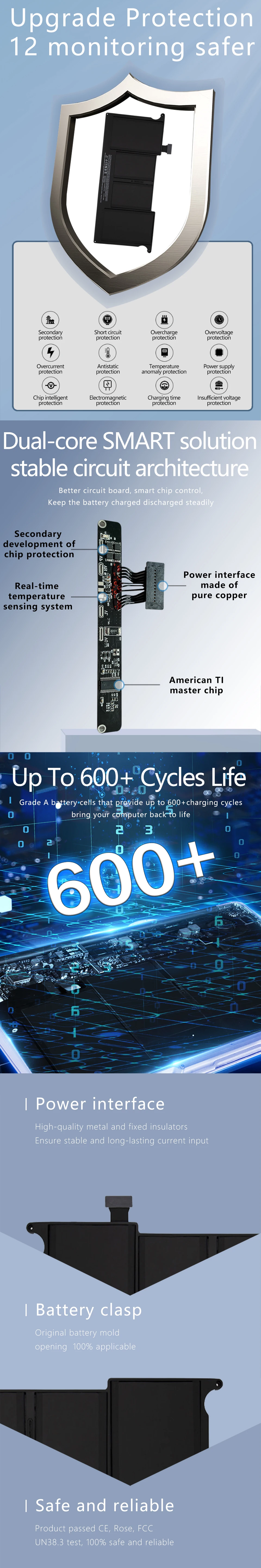 La Placa de protección de batería utiliza medidores de combustible de batería TI avanzados, proporciona protección de seguridad de primer y segundo nivel, contra sobretensión, subtensión, sobrecorriente, corriente de cortocircuito, sobrecarga y condiciones de sobretemperatura, así como otras fallas relacionadas con el paquete y la celda