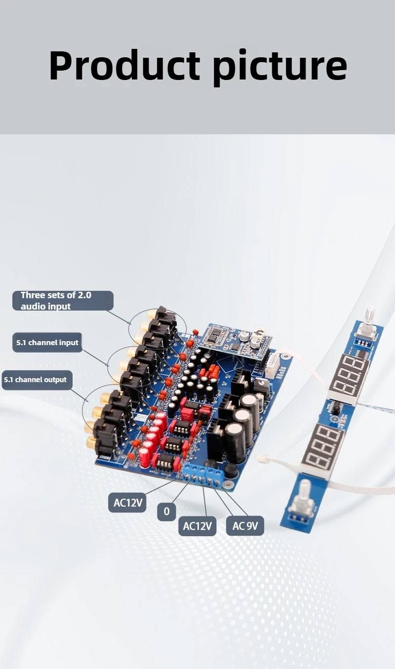 Modelo: panel de 5.1 canales Canales de salida: 6 canales Rango de respuesta de frecuencia: 20-20 KHZ Fuente de alimentación: AC12V-0-AC12V(1A)0-AC9V(1A) Distancia de transmisión Bluetooth: 10 metros Dimensiones: 140*95 mm, tablero de visualización 200*20 mm