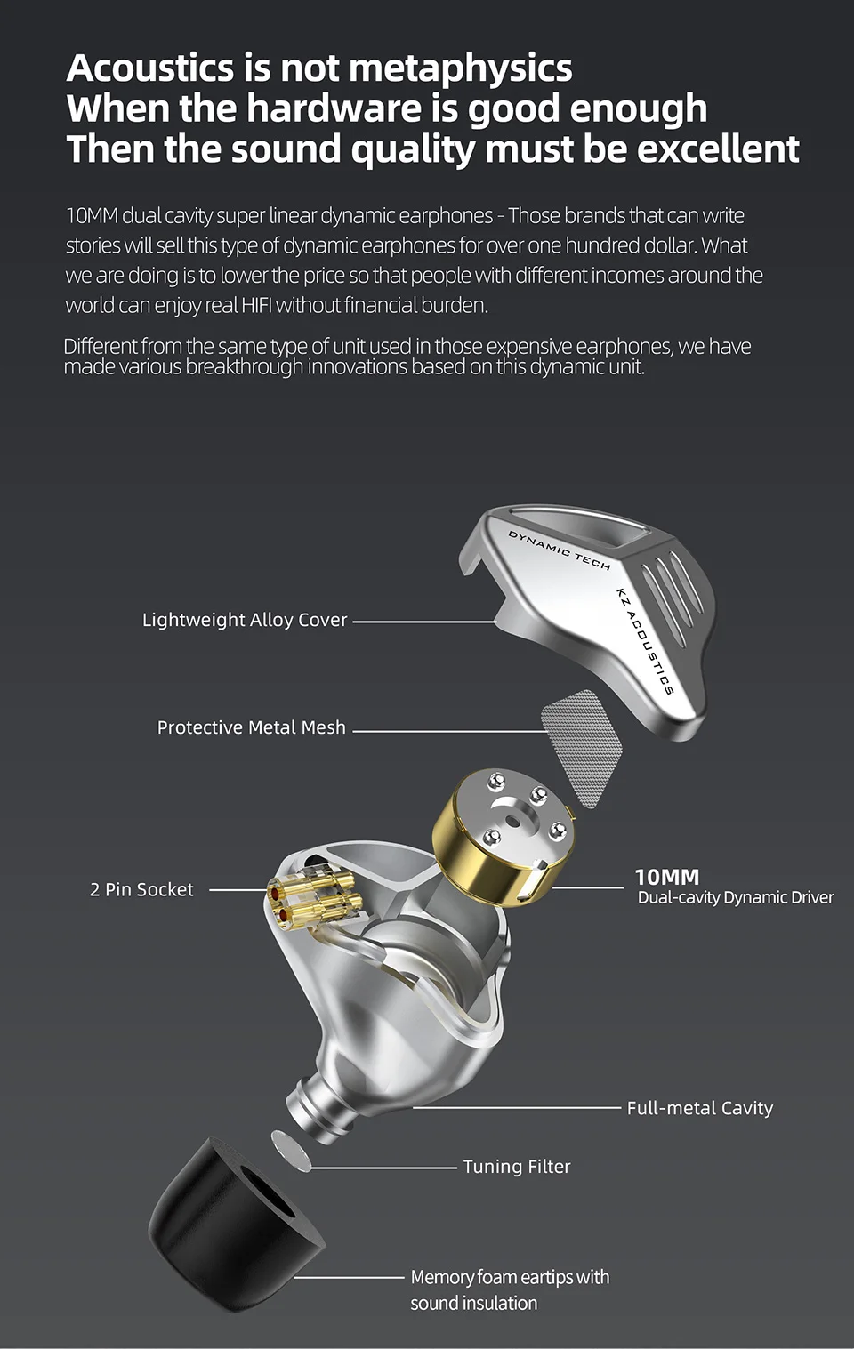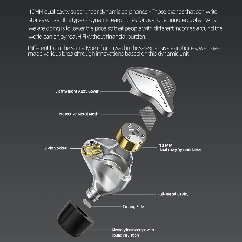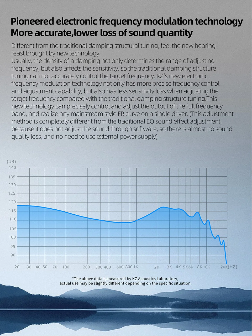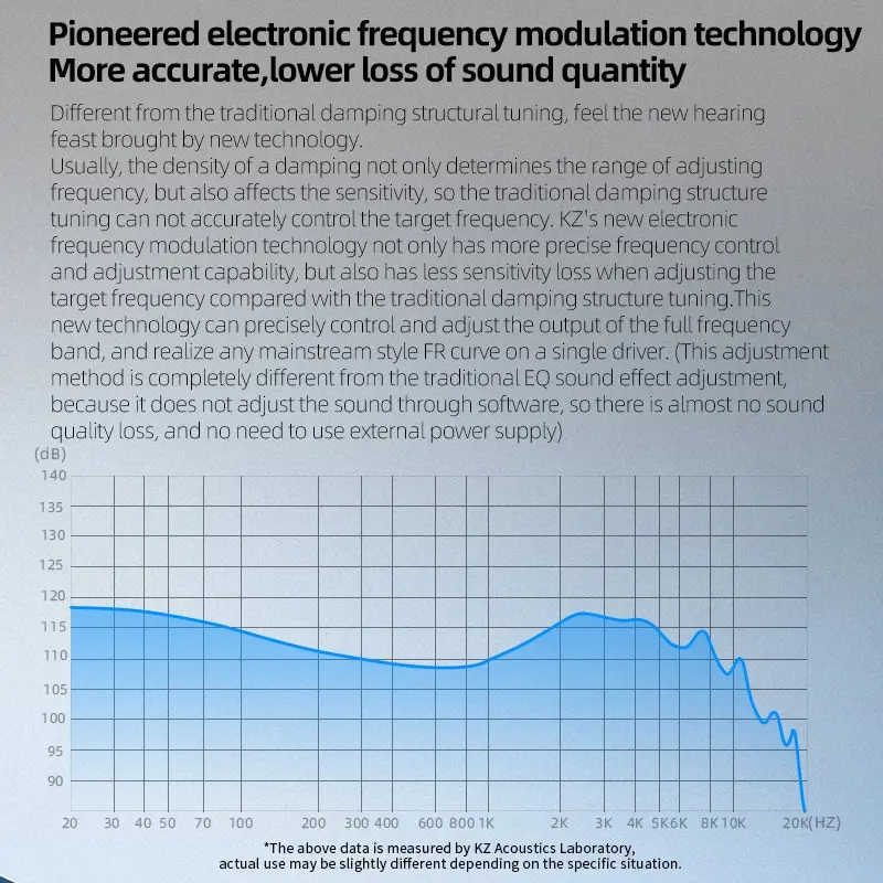 Por lo general, la densidad de una amortiguación no solo determina el rango de frecuencia de ajuste, sino que también afecta la sensibilidad, por lo que la afinación tradicional de la estructura de amortiguación no puede controlar con precisión la frecuencia objetivo. La nueva tecnología electrónica de modulación de frecuencia de KZ no solo tiene un control de frecuencia y una capacidad de ajuste más precisos, sino que también tiene menos pérdida de sensibilidad al ajustar la frecuencia objetivo en comparación con la estructura de amortiguación tradicional. Esta nueva tecnología puede controlar y ajustar con precisión la salida de la banda de frecuencia completa, y realizar cualquier curva FR de estilo convencional en un solo controlador. (Este método de ajuste es completamente diferente del ajuste tradicional del efecto de sonido EQ, porque no ajusta el sonido a través del software, por lo que casi no hay soundqualityloss, Y no hay necesidad de utilizar la fuente de alimentación externa)